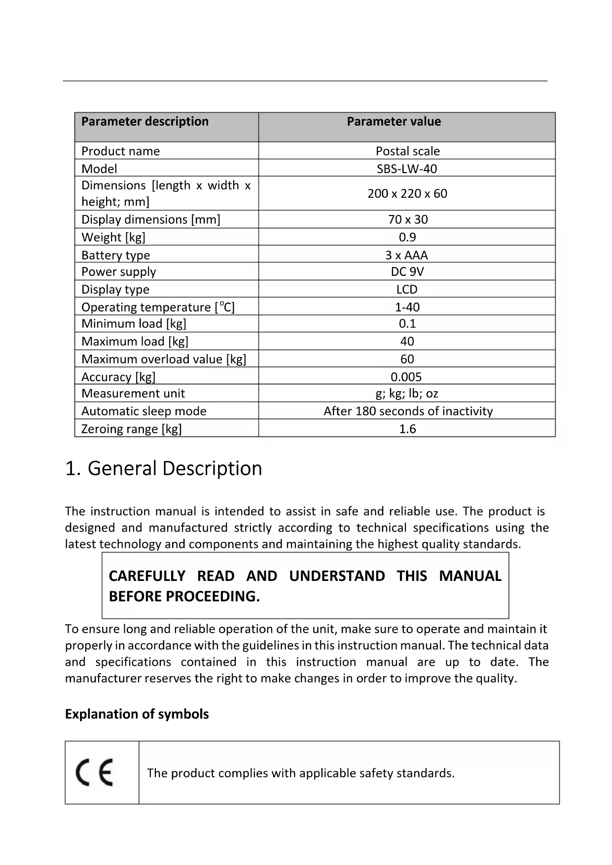 Parameter description Parameter value Product name Postal scale Model SBS-PT-200SK SBS-PT-100SK CAUTION! This User Manual has been translated for your convenience using machine translation. Reasonable efforts have been made to provide an accurate translation; however, no automated translation is perfect nor is it intended to replace human translators. The official User Manual is the English version. Any discrepancies or differences created in the translation are not binding and have no legal effect for compliance or enforcement purposes. If any questions arise related to the accuracy of the information contained in the User Manual, please refer to the English version of those contents which is the official version.Dimensions [length x width x height; mm] 360 x 405 x 65 Display dimensions [mm] 135 x 65 Weight [kg]