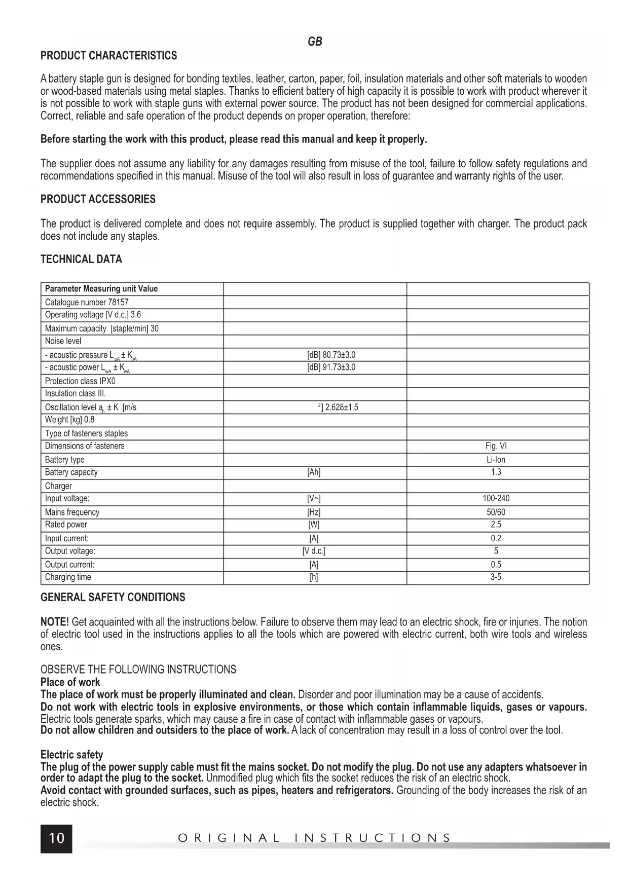 PRODUCT CHARACTERISTICS A battery staple gun is designed for bonding textiles, leather, carton, paper, foil, insulation materials and other soft materials to wooden or wood-based materials using metal staples. Thanks to efficient battery of high capacity it is possible to work with product wherever it is not possible to work with staple guns with external power source. The product has not been designed for commercial applications. Correct, reliable and safe operation of the product depends on proper operation, therefore: Before starting the work with this product, please read this manual and keep it properly. The supplier does not assume any liability for any damages resulting from misuse of the tool, failure to follow safety regulations and recommendations specified in this manual. Misuse of the tool will also result in loss of guarantee and warranty rights of the user. PRODUCT ACCESSORIES The product is delivered complete and does not require assembly. The product is supplied together with charger. The product pack does not include any staples. TECHNICAL DATA Parameter Measuring unit Value Catalogue number 78157 Operating voltage [V d.c.] 3.6 Maximum capacity [staple/min] 30 Noise level - acoustic pressure L