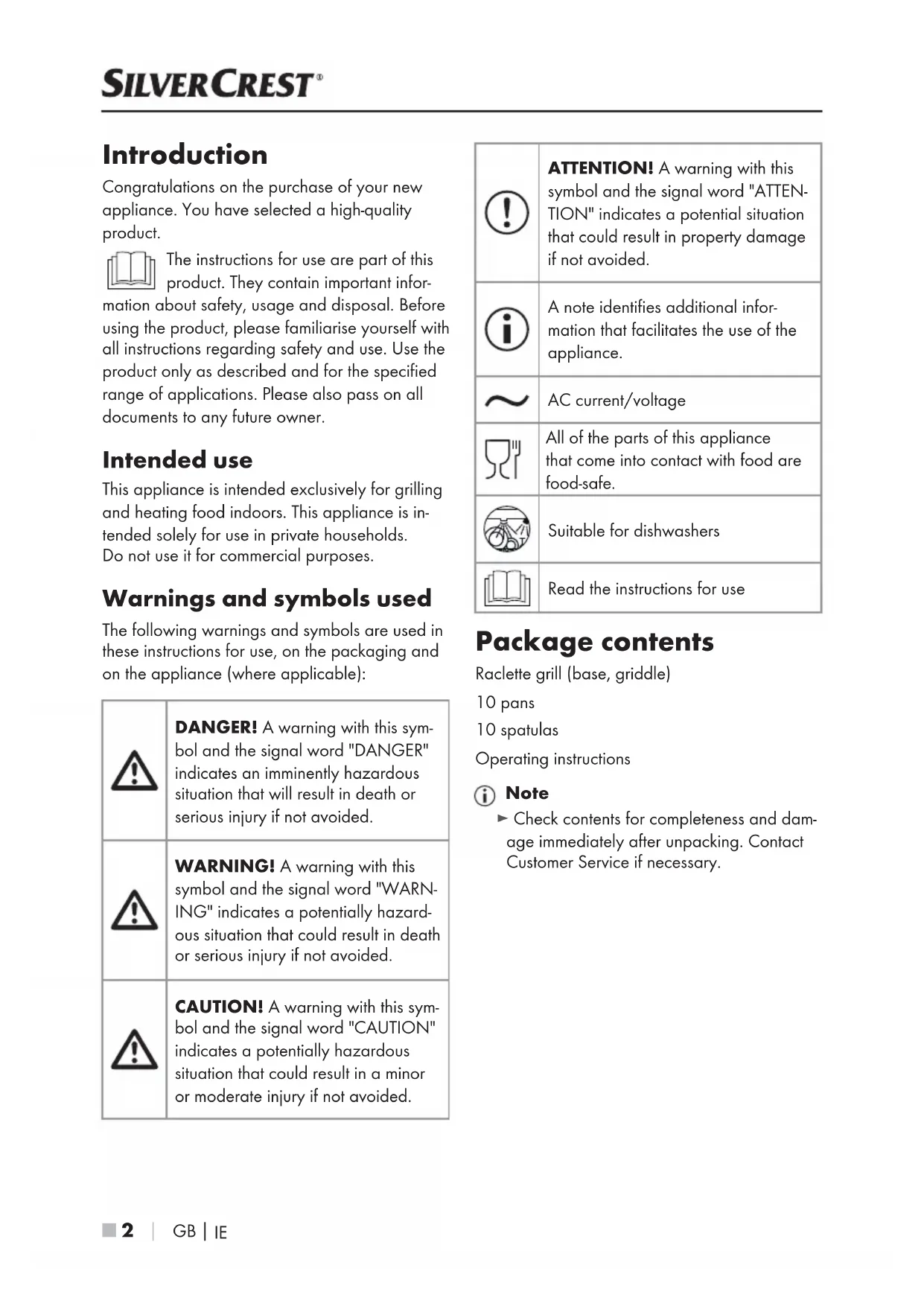 Introduction Congratulations on the purchase of your new appliance. You have selected a high-quality product. The instructions for use are part of this product. They contain important infor- mation about safety, usage and disposal. Before using the product, please familiarise yourself with all instructions regarding safety and use. Use the product only as described and for the specified range of applications. Please also pass on all documents to any future owner. Intended use This appliance is intended exclusively for grilling and heating food indoors. This appliance is in- tended solely for use in private households. Do not use it for commercial purposes. Warnings and symbols used The following warnings and symbols are used in these instructions for use, on the packaging and on the appliance (where applicable): DANGER! A warning with this sym- bol and the signal word "DANGER" indicates an imminently hazardous situation that will result in death or serious injury if not avoided. WARNING! A warning with this symbol and the signal word "WARN- ING" indicates a potentially hazard- ous situation that could result in death or serious injury if not avoided. CAUTION! A warning with this sym- bol and the signal word "CAUTION" indicates a potentially hazardous situation that could result in a minor or moderate injury if not avoided. ATTENTION! A warning with this symbol and the signal word "ATTEN- TION" indicates a potential situation that could result in property damage if not avoided. A note identifies additional infor- mation that facilitates the use of the appliance. AC current/voltage All of the parts of this appliance that come into contact with food are food-safe. Suitable for dishwashers Read the instructions for use Package contents Raclette grill (base, griddle) 10 pans 10 spatulas Operating instructions Note ► Check contents for completeness and dam- age immediately after unpacking. Contact Customer Service if necessary. IB_460256_SRGM1500B2_LB8.indb 2 11.06.2024 10:35:56GB