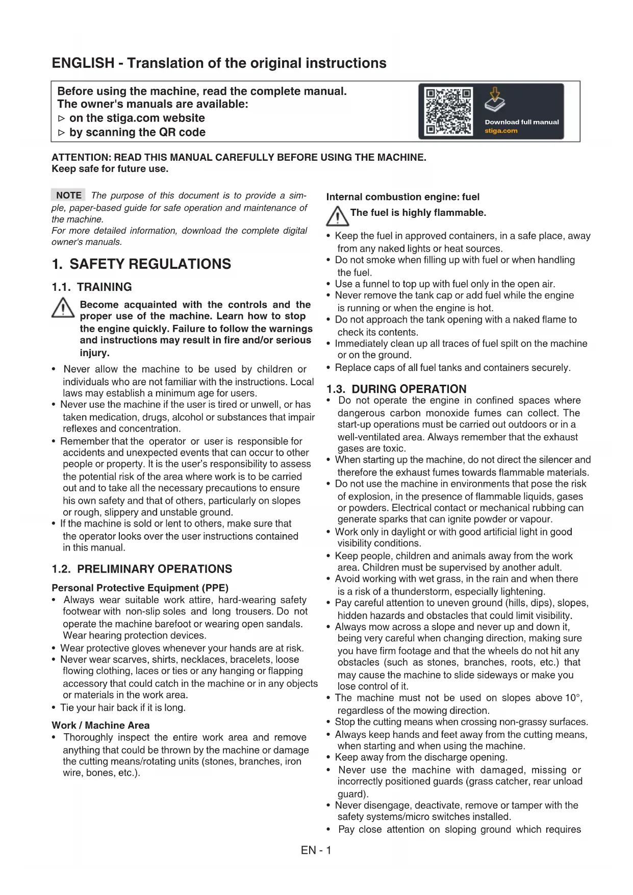 1.1. TRAINING Become acquainted with the controls and the proper use of the machine. Learn how to stop the engine quickly. Failure to follow the warnings and instructions may result in re and/or serious injury.