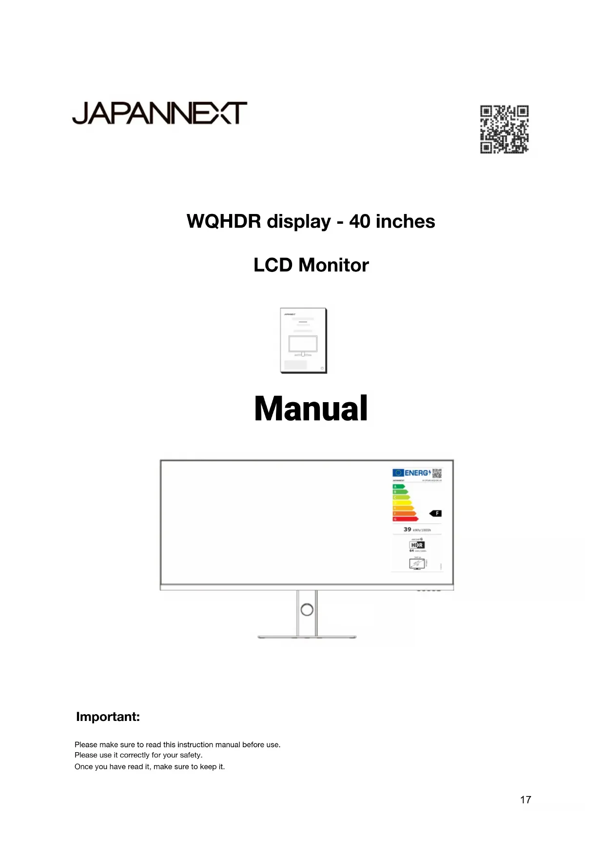 Download the instructions for your Monitor in PDF format for free! Find your manual JNIPS40UWQHDR144 - Japannext and take your electronic device back in hand. On this page are published all the documents necessary for the use of your device. JNIPS40UWQHDR144 by Japannext.