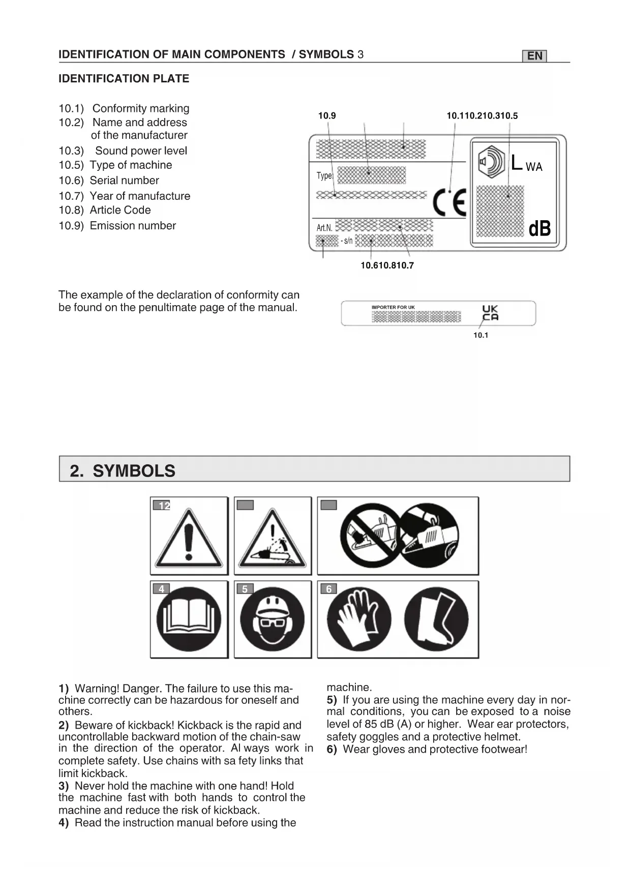 | EF-Samsvarserklæring(Maskindrektiv 2006/42/EF, Vedlegg II, del A)1. Firmaet2. Erklaer på eget ansvar at maskinen:Kjedesag für vanlig skogbruKedfelling/kutt/kvisting av træa)Type / Modelb) Maned / Byggárc)Serienummerd) Motor: forbrenningsmotor3. Oppyller kravene i direktivene:e) Sertifieringsorganf) EF-typeproving4. Hervisning til harmoniserte standarderg) Målt lyleffektniva)Garantert lyleffektniva)j) Installer nettoeffektn) Person som har fullmakt til ä utferdige teknik dokumentasjon: o) Sted og dato | EG-försakran om överensstammelse(Maskindrektiv 2006/42/EG, bilaga II,de la)1. Företaget2. Försakrar på eget ansvar att maskinen: Kedjesag for skogsbarbeteFällning/kapning/grenklippning av trad)Typ / Basmodellb) Manad / Tillverkningsär)Serienummerd) Motor: forbrenningsmotor3. Överensstämmer med foreskriftnerna i direktivetIntygsoranger Anmält organf) EG typgodkännande4. Referens till harmoniseradestandarderg) Uppmätt luleffektniva)Garanterad luleffektniva)j) Installerer nettoeffektn) Auktoriserad person for upprattandetav den tekniska documentationen: o) Ort och datum | EF-overensstemmelseserklæring(Maskindrektiv 2006/42/EF, bilag II, del A)1. Firmaet2. Erklaer på eget ansvar, at maskinen:Kædesav til skovarbejdEfaildning af træer/udskæring af stykker/opskærig af grec)Type / Modelb) Maned / Konstruktionsär)Serienummerd) Motor: forbändingsmotor3. Er i overensstemmelse medspecifikationerne ifolge direktiverne:e) Certificeringsorganf) EF-typeprofvning4. Henvisning til harmoniserede standarderg) Målt lyleffektniveauh) Garanteret lydefektniveauj) Installerer nettoeffektn) Person, der har bemyndigelse til atudarbezde det tekniske dossier: o) Sted og dato |