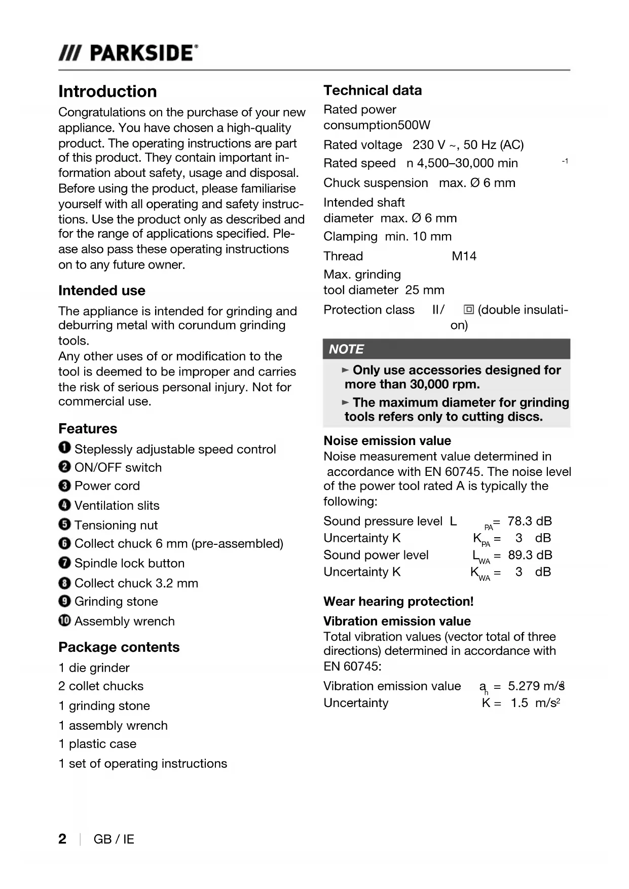 GB / IE Introduction Congratulations on the purchase of your new appliance. You have chosen a high-quality product. The operating instructions are part of this product. They contain important in- formation about safety, usage and disposal. Before using the product, please familiarise yourself with all operating and safety instruc- tions. Use the product only as described and for the range of applications specied. Ple- ase also pass these operating instructions on to any future owner. Intended use The appliance is intended for grinding and deburring metal with corundum grinding tools. Any other uses of or modication to the tool is deemed to be improper and carries the risk of serious personal injury. Not for commercial use. Features Steplessly adjustable speed control ON/OFF switch Power cord Ventilation slits Tensioning nut Collect chuck 6 mm (pre-assembled) Spindle lock button Collect chuck 3.2 mm Grinding stone Assembly wrench Package contents 1 die grinder 2 collet chucks 1 grinding stone 1 assembly wrench 1 plastic case 1 set of operating instructions Technical data Rated power consumption 500 W Rated voltage 230 V ~, 50 Hz (AC) Rated speed n 4,500–30,000 min