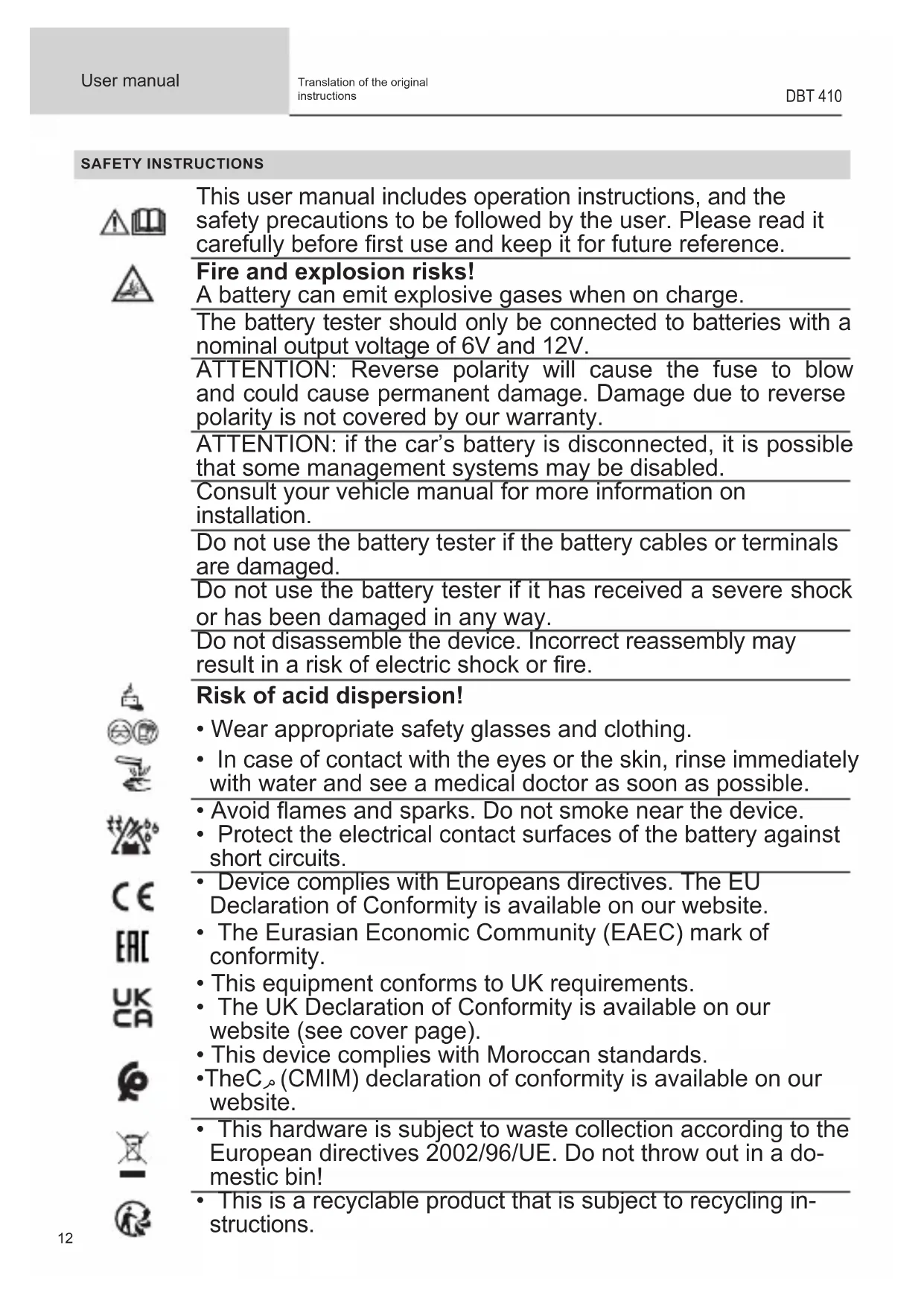 - Les pannes liées à l’environnement (pollution, rouille, poussière). En cas de panne, retourner l’appareil à votre distributeur, en y joignant : - un justicatif d’achat daté (ticket de sortie de caisse, facture….) - une note explicative de la panne.12 User manual DBT 410 Translation of the original instructions SAFETY INSTRUCTIONS This user manual includes operation instructions, and the safety precautions to be followed by the user. Please read it carefully before rst use and keep it for future reference. Fire and explosion risks! A battery can emit explosive gases when on charge. The battery tester should only be connected to batteries with a nominal output voltage of 6V and 12V. ATTENTION: Reverse polarity will cause the fuse to blow and could cause permanent damage. Damage due to reverse polarity is not covered by our warranty. ATTENTION: if the car’s battery is disconnected, it is possible that some management systems may be disabled. Consult your vehicle manual for more information on installation. Do not use the battery tester if the battery cables or terminals are damaged. Do not use the battery tester if it has received a severe shock or has been damaged in any way. Do not disassemble the device. Incorrect reassembly may result in a risk of electric shock or re. Risk of acid dispersion!