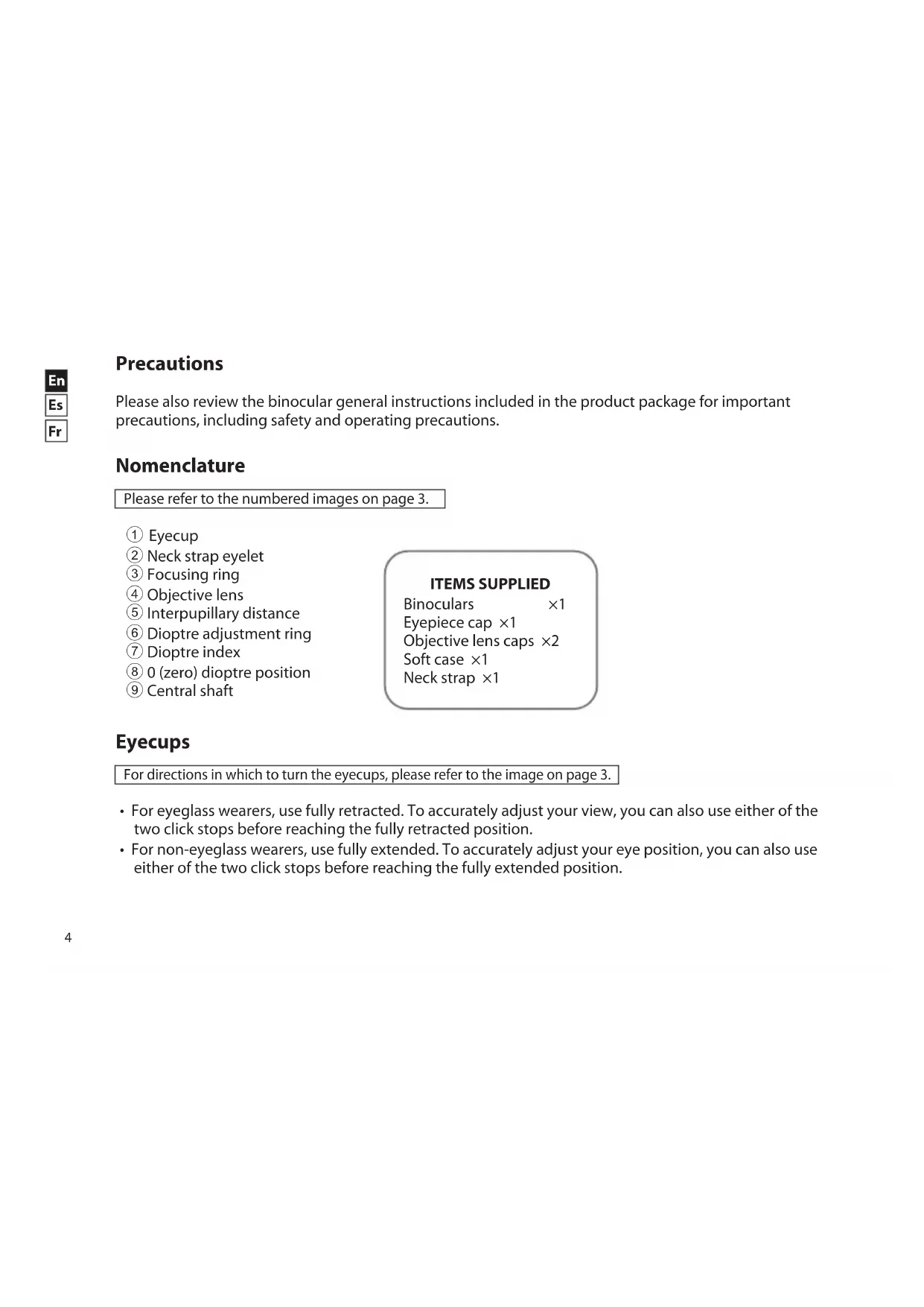 Precautions Please also review the binocular general instructions included in the product package for important precautions, including safety and operating precautions. Nomenclature Please refer to the numbered images on page 3. 1 Eyecup 2 Neck strap eyelet 3 Focusing ring 4 Objective lens 5 Interpupillary distance 6 Dioptre adjustment ring 7 Dioptre index 8 0 (zero) dioptre position 9 Central shaft ITEMS SUPPLIED Binoculars ×1 Eyepiece cap ×1 Objective lens caps ×2 Soft case ×1 Neck strap ×1 Eyecups For directions in which to turn the eyecups, please refer to the image on page 3.
