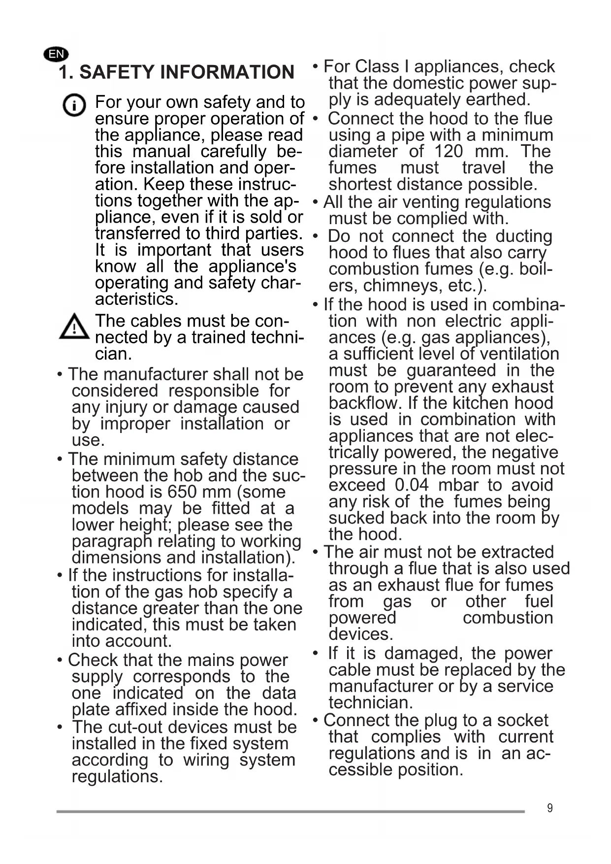 - Connect the plug to a socket that complies with current regulations and is in an ac- cessible position. 9• As regards the technical and safety measures to be taken for exhausting of fumes, it is important that the regulations set by local authorities be complied with scrupulously. CAUTION: remove the protective films before in- stalling the hood.