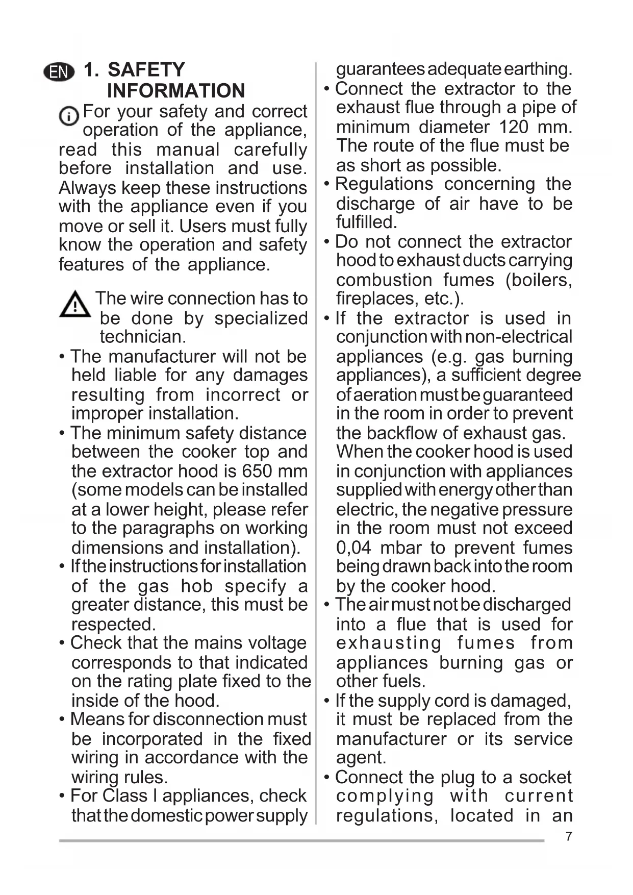 - If the extractor is used in conjunction with non-electrical appliances (e.g. gas burning appliances), a sufcient degree of aeration must be guaranteed in the room in order to prevent the backow of exhaust gas. When the cooker hood is used in conjunction with appliances supplied with energy other than electric, the negative pressure in the room must not exceed 0,04 mbar to prevent fumes being drawn back into the room by the cooker hood.
