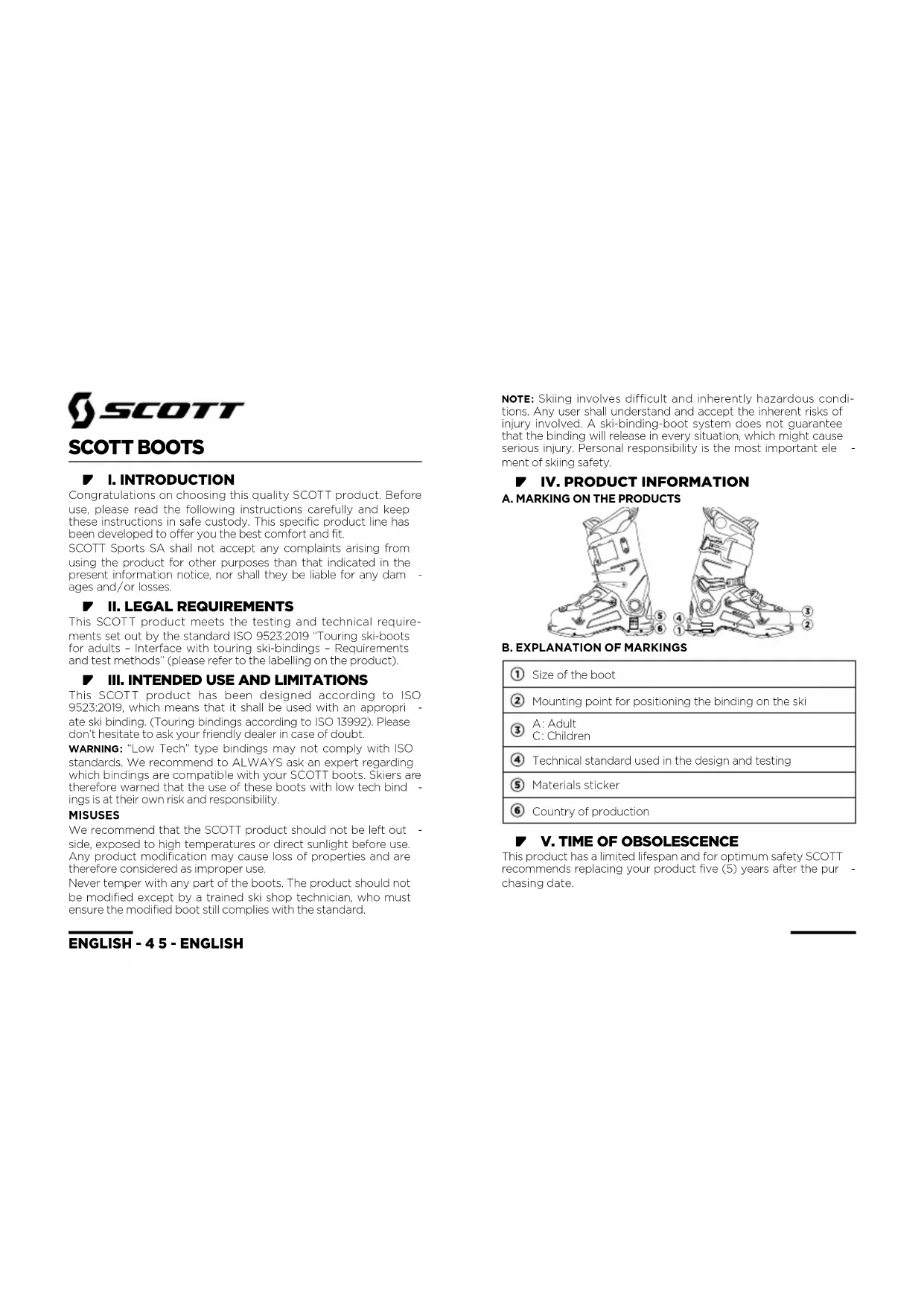 - II. LEGAL REQUIREMENTS This SCOTT product meets the testing and technical require- ments set out by the standard ISO 9523:2019 “Touring ski-boots for adults – Interface with touring ski-bindings – Requirements and test methods” (please refer to the labelling on the product).