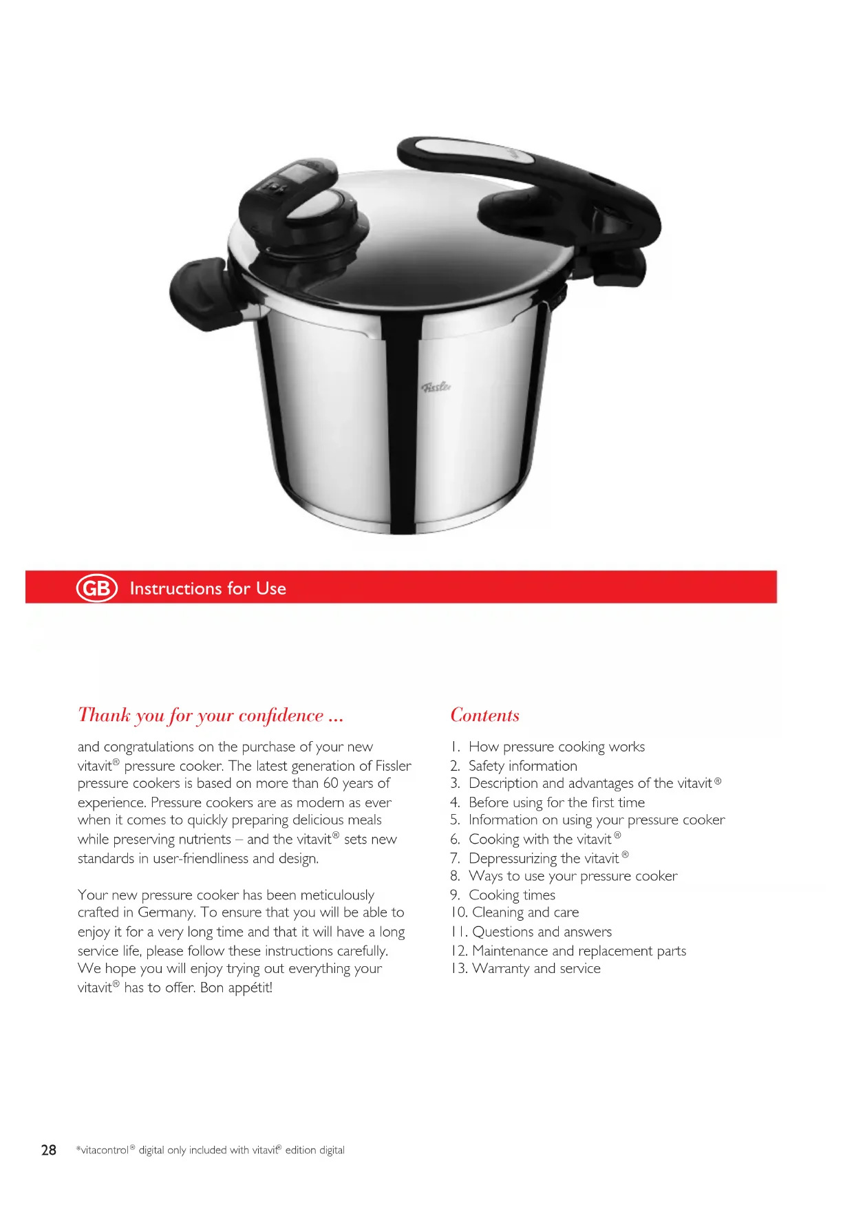 sets new standards in user-friendliness and design. Your new pressure cooker has been meticulously crafted in Germany. To ensure that you will be able to enjoy it for a very long time and that it will have a long service life, please follow these instructions carefully. We hope you will enjoy trying out everything your vitavit