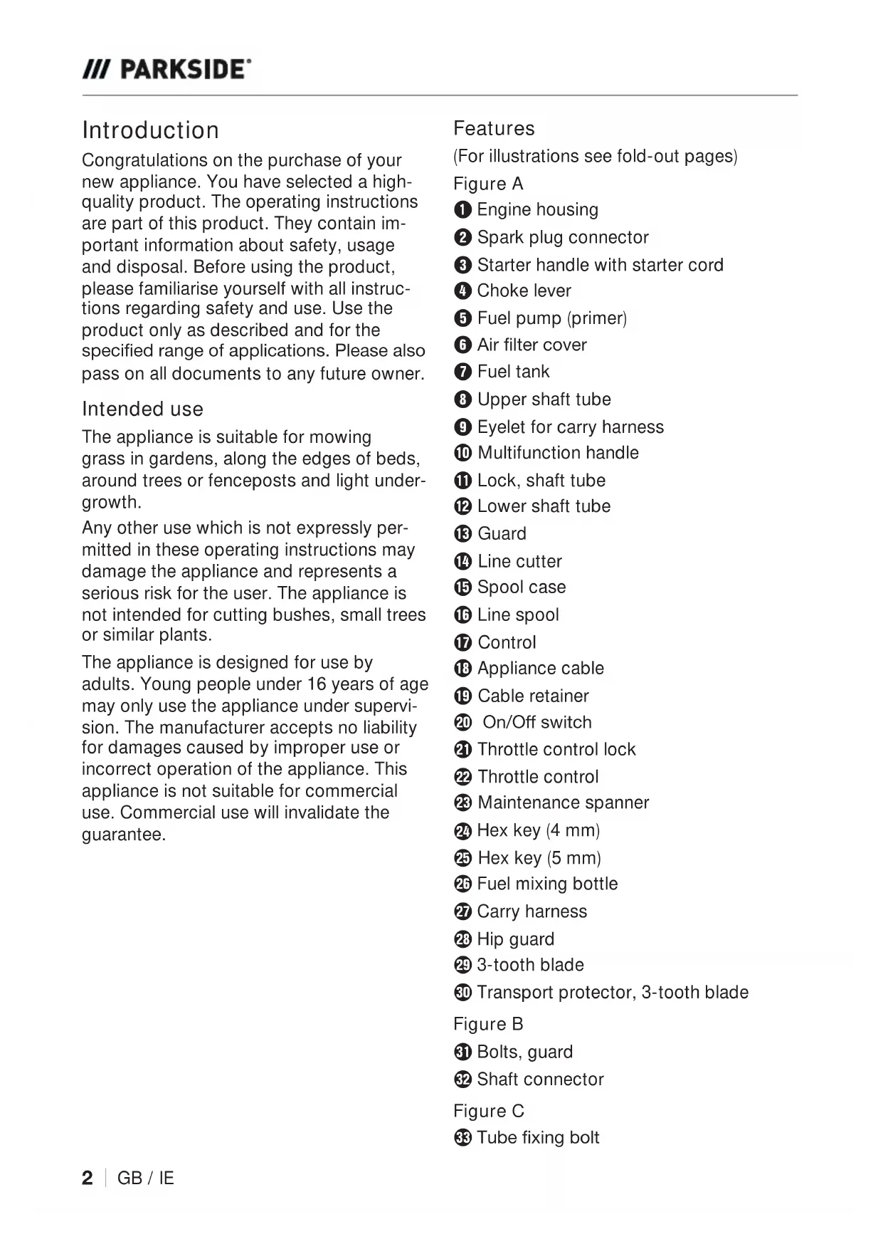 ֺGB / IE Introduction Congratulations on the purchase of your new appliance. You have selected a high- quality product. The operating instructions are part of this product. They contain im- portant information about safety, usage and disposal. Before using the product, please familiarise yourself with all instruc- tions regarding safety and use. Use the product only as described and for the VSHFLƞHGUDQJHRIDSSOLFDWLRQV3OHDVHDOVR pass on all documents to any future owner. Intended use The appliance is suitable for mowing grass in gardens, along the edges of beds, around trees or fenceposts and light under- growth. Any other use which is not expressly per- mitted in these operating instructions may damage the appliance and represents a serious risk for the user. The appliance is not intended for cutting bushes, small trees or similar plants. The appliance is designed for use by adults. Young people under 16 years of age may only use the appliance under supervi- sion. The manufacturer accepts no liability for damages caused by improper use or incorrect operation of the appliance. This appliance is not suitable for commercial use. Commercial use will invalidate the guarantee. Features (For illustrations see fold-out pages) Figure A 1 Engine housing 2 Spark plug connector 3 Starter handle with starter cord 4 Choke lever 5 Fuel pump (primer) 6 $LUƞOWHUFRYHU 7 Fuel tank 8 Upper shaft tube 9 Eyelet for carry harness 0 Multifunction handle q Lock, shaft tube w Lower shaft tube e Guard r Line cutter t Spool case z Line spool u Control i Appliance cable o Cable retainer p2Q2ƙVZLWFK a Throttle control lock s Throttle control d Maintenance spanner
