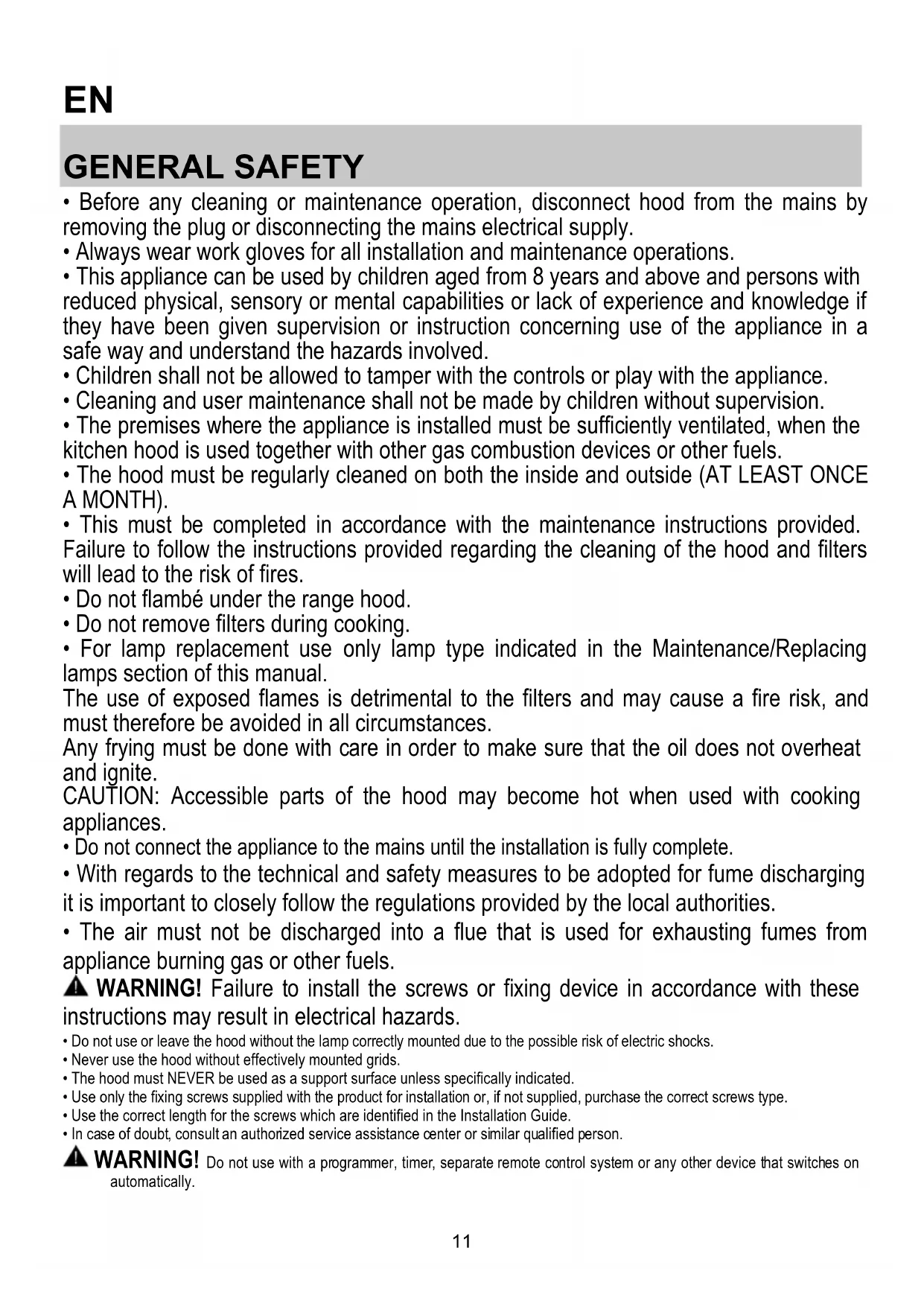 - Before any cleaning or maintenance operation, disconnect hood from the mains by removing the plug or disconnecting the mains electrical supply.
