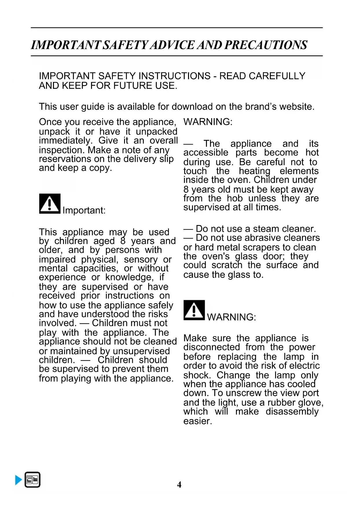 The appliance and its accessible parts become hot during use. Be careful not to touch the heating elements inside the oven. Children under 8 years old must be kept away from the hob unless they are supervised at all times.