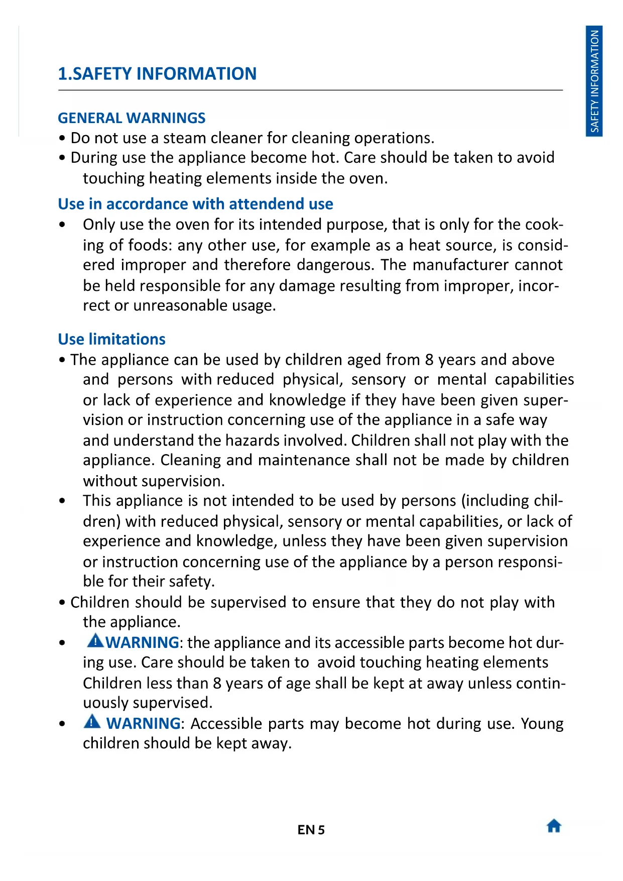 - Only use the oven for its intended purpose, that is only for the cook- ing of foods: any other use, for example as a heat source, is consid- ered improper and therefore dangerous. The manufacturer cannot be held responsible for any damage resulting from improper, incor- rect or unreasonable usage. Use limitations