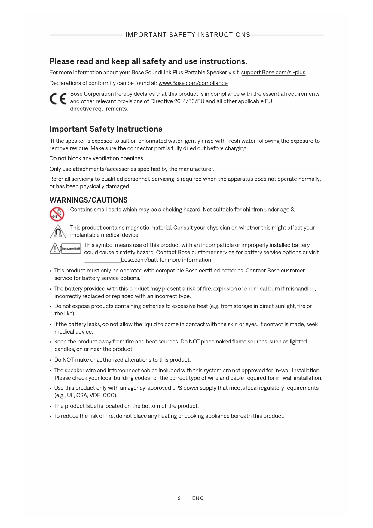 ENG Please read and keep all safety and use instructions. For more information about your Bose SoundLink Plus Portable Speaker, visit: support.Bose.com/sl-plussupport.Bose.com/sl-plus Declarations of conformity can be found at: www.Bose.com/compliancewww.Bose.com/compliance Bose Corporation hereby declares that this product is in compliance with the essential requirements and other relevant provisions of Directive 2014/53/EU and all other applicable EU directive requirements. Important Safety Instructions If the speaker is exposed to salt or chlorinated water, gently rinse with fresh water following the exposure to remove residue. Make sure the connector port is fully dried out before charging. Do not block any ventilation openings. Only use aachments/accessories specified by the manufacturer. Refer all servicing to qualified personnel. Servicing is required when the apparatus does not operate normally, or has been physically damaged. WARNINGS/CAUTIONS Contains small parts which may be a choking hazard. Not suitable for children under age 3. This product contains magnetic material. Consult your physician on whether this might aect your implantable medical device. This symbol means use of this product with an incompatible or improperly installed baery could cause a safety hazard. Contact Bose customer service for baery service options or visit bose.com/babose.com/ba for more information.