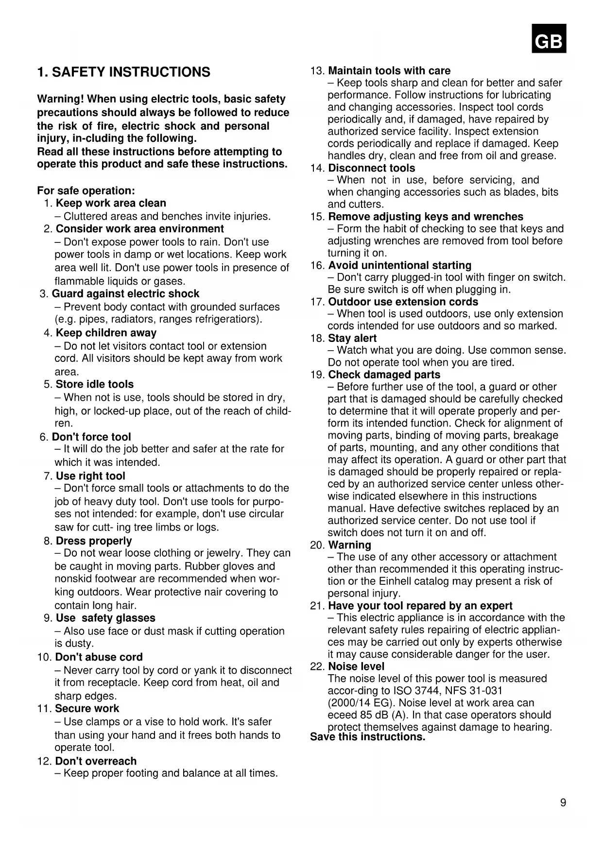 The noise level of this power tool is measured accor-ding to ISO 3744, NFS 31-031 (2000/14 EG). Noise level at work area can eceed 85 dB (A). In that case operators should protect themselves against damage to hearing. Save this instructions.GB Safety instructions Please read and follow the safety instructions carefully.