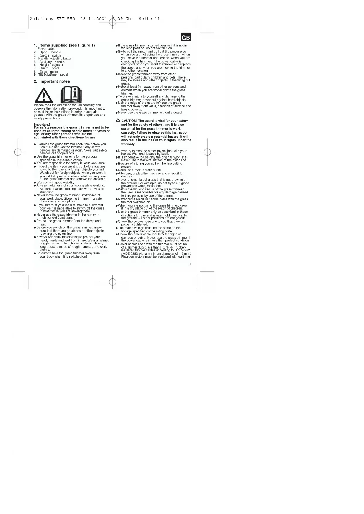 Anleitung ERT 550 18.11.2004 9:29 Uhr Seite 11contacts and the coupling must be rain-water- protected. Keep cables and other objects out of the area you want to cut. If you have to lift the grass trimmer to move it, switch off the motor and wait for the rotating tool to stop. Before you leave the trimmer, switch off the motor and pull out the power plug. Before you connect the grass trimmer to the power supply, make sure that none of its moving parts are damaged and that the line spool is correctly inserted and fastened. Never cut against hard objects when using the grass trimmer. This is imperative to avoid causing injury to the user and damage to the trimmer. Use only original replacement parts for repair and maintenance purposes. Have repairs carried out only by a qualified electrician. Examine the grass trimmer for signs of wear or damage each time before you use it and after any collisions. Have essential repairs carried out without delay. Always keep your hands and feet away from the cutting mechanism, particularly when you switch on the trimmer. After pulling out new line, always return the trimmer to normal working position before you switch it on again. Never use replacement parts or accessories which are not foreseen or recommended by the manufacturer. Pull out the power plug before carrying out any inspection, cleaning or other work on the trimmer and whenever it is not being used. Caution! The nylon line will run on for a few seconds after the tool is switched off!
