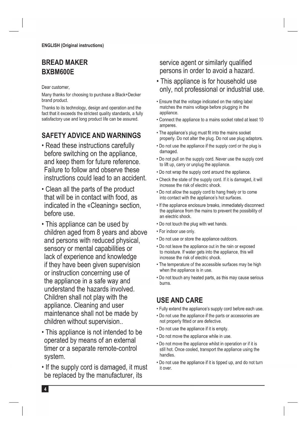 ENGLISH (Original instructions) BREAD MAKER BXBM600E Dear customer, Many thanks for choosing to purchase a Black+Decker brand product. Thanks to its technology, design and operation and the fact that it exceeds the strictest quality standards, a fully satisfactory use and long product life can be assured.