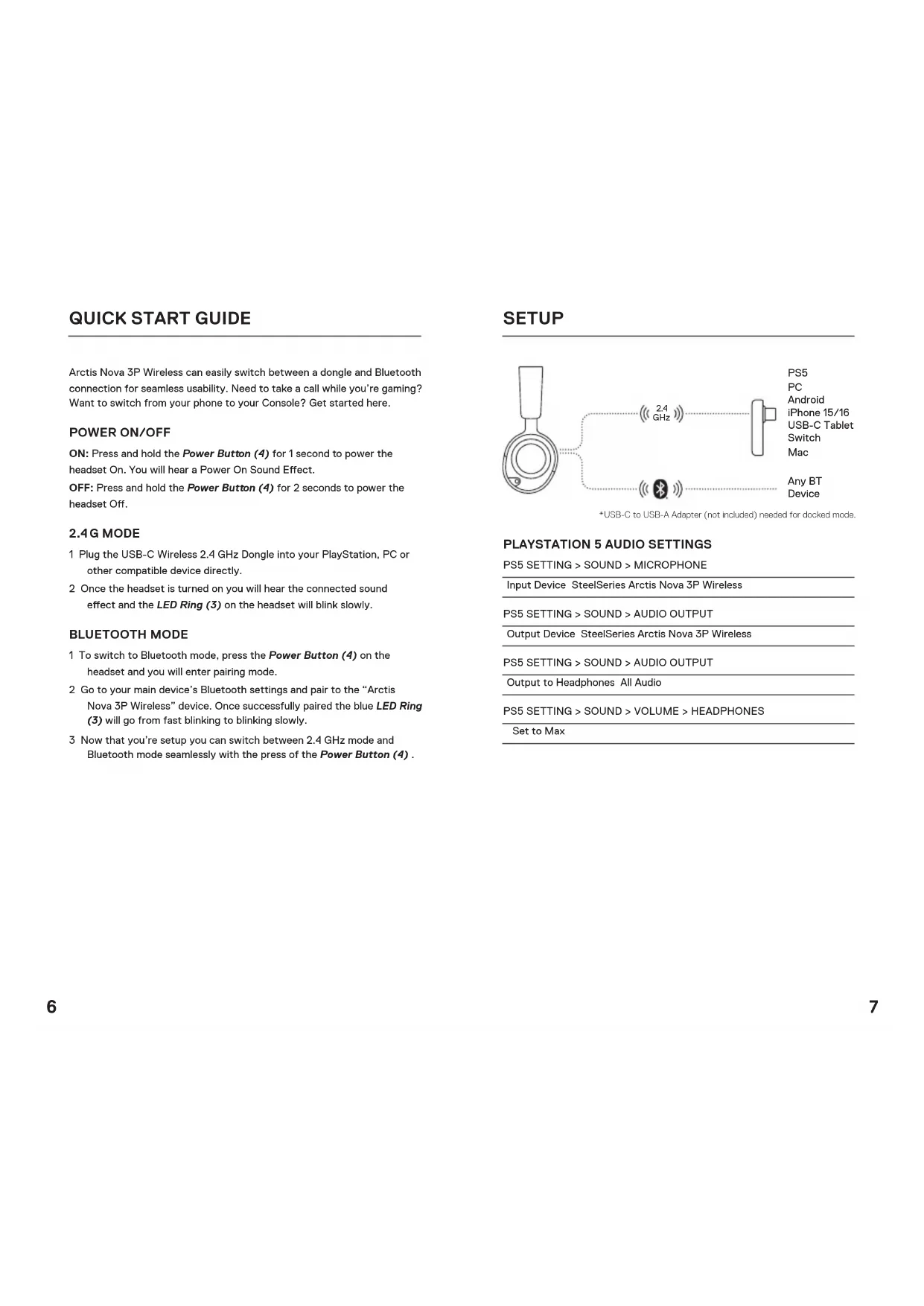1 Plug the USB-C Wireless 2.4 GHz Dongle into your PlayStation, PC or other compatible device directly. 2 Once the headset is turned on you will hear the connected sound eect and the LED Ring (3) on the headset will blink slowly. BLUETOOTH MODE 1 To switch to Bluetooth mode, press the Power Button (4) on the headset and you will enter pairing mode. 2 Go to your main device’s Bluetooth settings and pair to the “Arctis Nova 3P Wireless” device. Once successfully paired the blue LED Ring (3) will go from fast blinking to blinking slowly. 3 Now that you’re setup you can switch between 2.4 GHz mode and Bluetooth mode seamlessly with the press of the Power Button (4) . SETUP *USB-C to USB-A Adapter (not included) needed for docked mode.