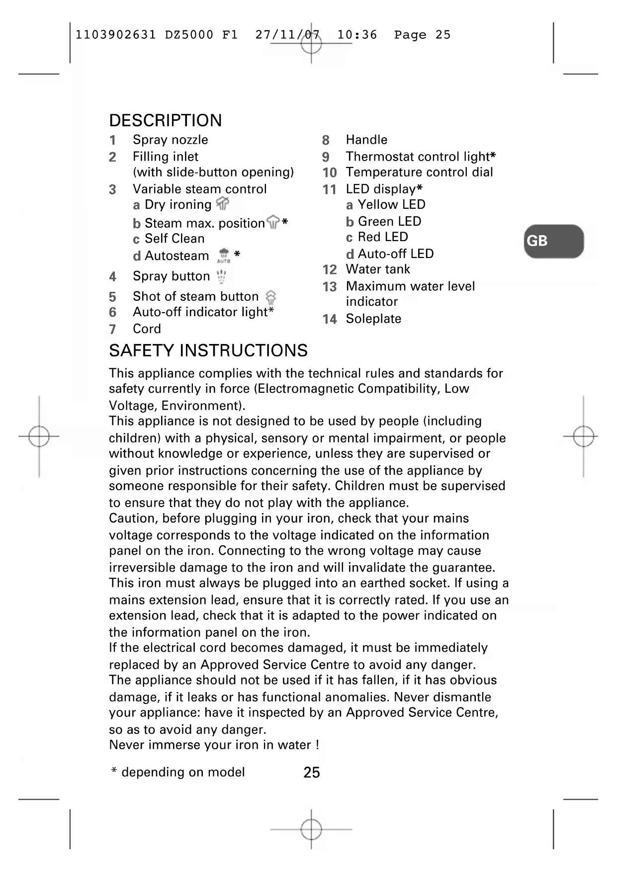 Soleplate DESCRIPTION SAFETY INSTRUCTIONS This appliance complies with the technical rules and standards for safety currently in force (Electromagnetic Compatibility, Low Voltage, Environment). This appliance is not designed to be used by people (including children) with a physical, sensory or mental impairment, or people without knowledge or experience, unless they are supervised or given prior instructions concerning the use of the appliance by someone responsible for their safety. Children must be supervised to ensure that they do not play with the appliance. Caution, before plugging in your iron, check that your mains voltage corresponds to the voltage indicated on the information panel on the iron. Connecting to the wrong voltage may cause irreversible damage to the iron and will invalidate the guarantee. This iron must always be plugged into an earthed socket. If using a mains extension lead, ensure that it is correctly rated. If you use an extension lead, check that it is adapted to the power indicated on the information panel on the iron. If the electrical cord becomes damaged, it must be immediately replaced by an Approved Service Centre to avoid any danger. The appliance should not be used if it has fallen, if it has obvious damage, if it leaks or has functional anomalies. Never dismantle your appliance: have it inspected by an Approved Service Centre, so as to avoid any danger. Never immerse your iron in water !