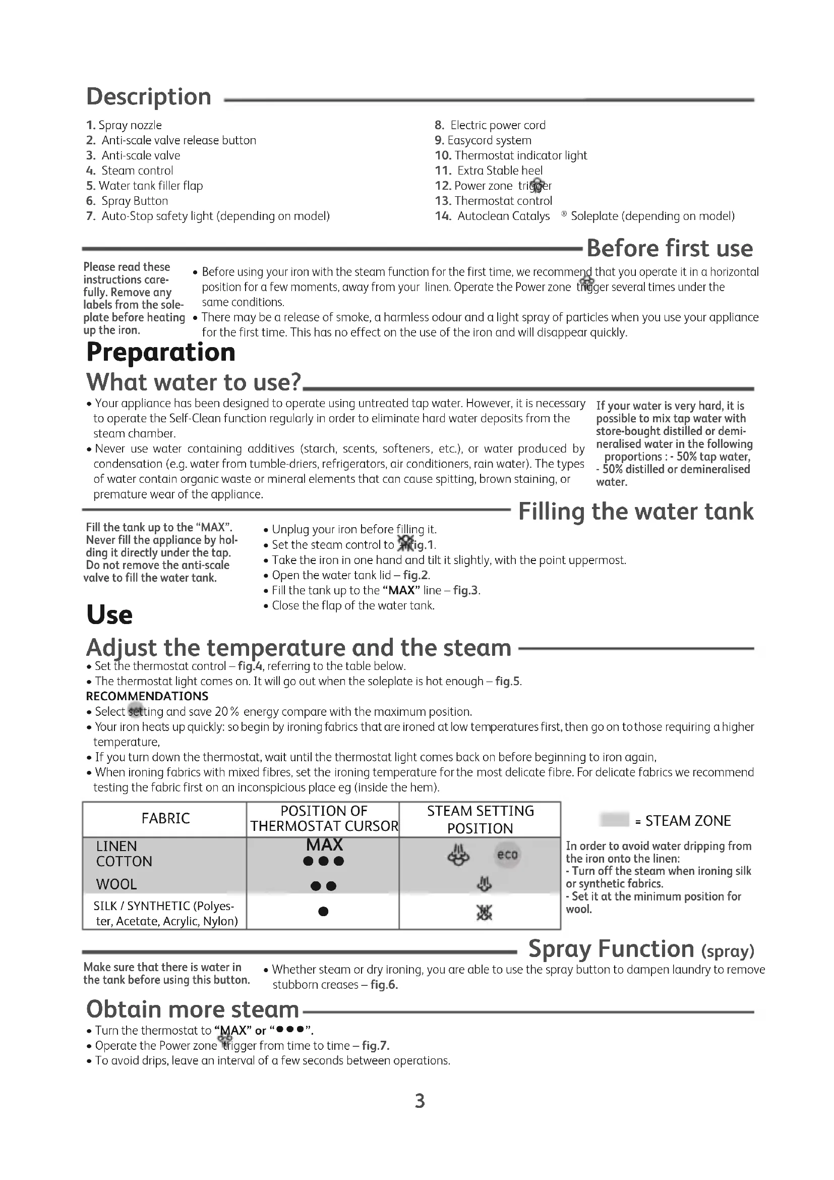 - Turn the thermostat to “MAX” or “•••”.• Operate the Power zone trigger from time to time – fig.7.• To avoid drips, leave an interval of a few seconds between operations.Fill the tank up to the “MAX”.Never fill the appliance by hol-ding it directly under the tap.Do not remove the anti-scalevalve to fill the water tank.If your water is very hard, it ispossible to mix tap water withstore-bought distilled or demi-neralised water in the following proportions : - 50% tap water,- 50% distilled or demineralisedwater.= STEAM ZONEIn order to avoid water dripping fromthe iron onto the linen:- Turn off the steam when ironing silkor synthetic fabrics.- Set it at the minimum position forwool.Make sure that there is water inthe tank before using this button.FABRICPOSITION OFTHERMOSTAT CURSORSTEAM SETTINGPOSITIONLINENCOTTON WOOL SILK / SYNTHETIC (Polyes-ter, Acetate, Acrylic, Nylon) MAX