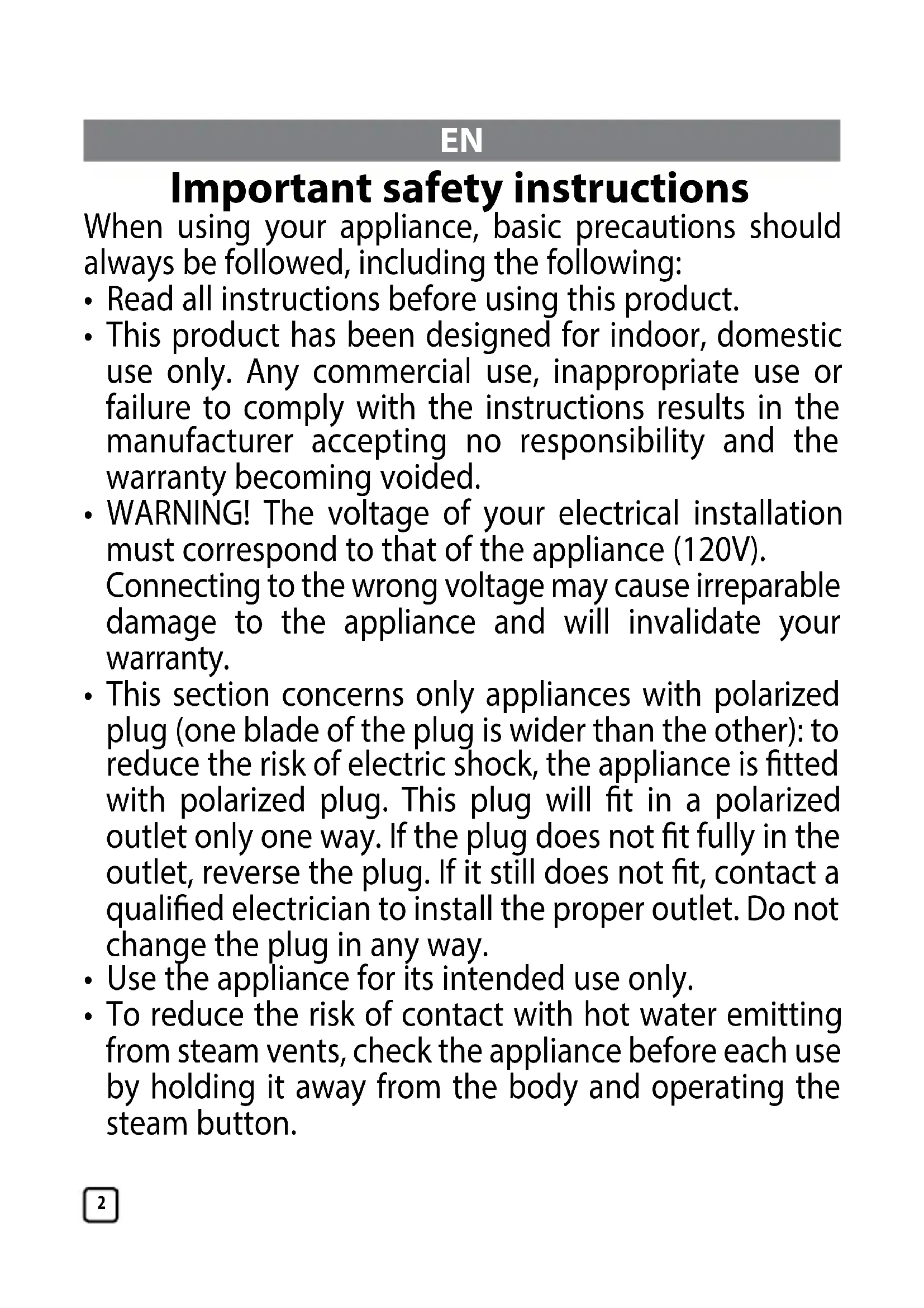 - This section concerns only appliances with polarized plug (one blade of the plug is wider than the other): to reduce the risk of electric shock, the appliance is tted with polarized plug. This plug will t in a polarized outlet only one way. If the plug does not t fully in the outlet, reverse the plug. If it still does not t, contact a qualied electrician to install the proper outlet. Do not change the plug in any way.