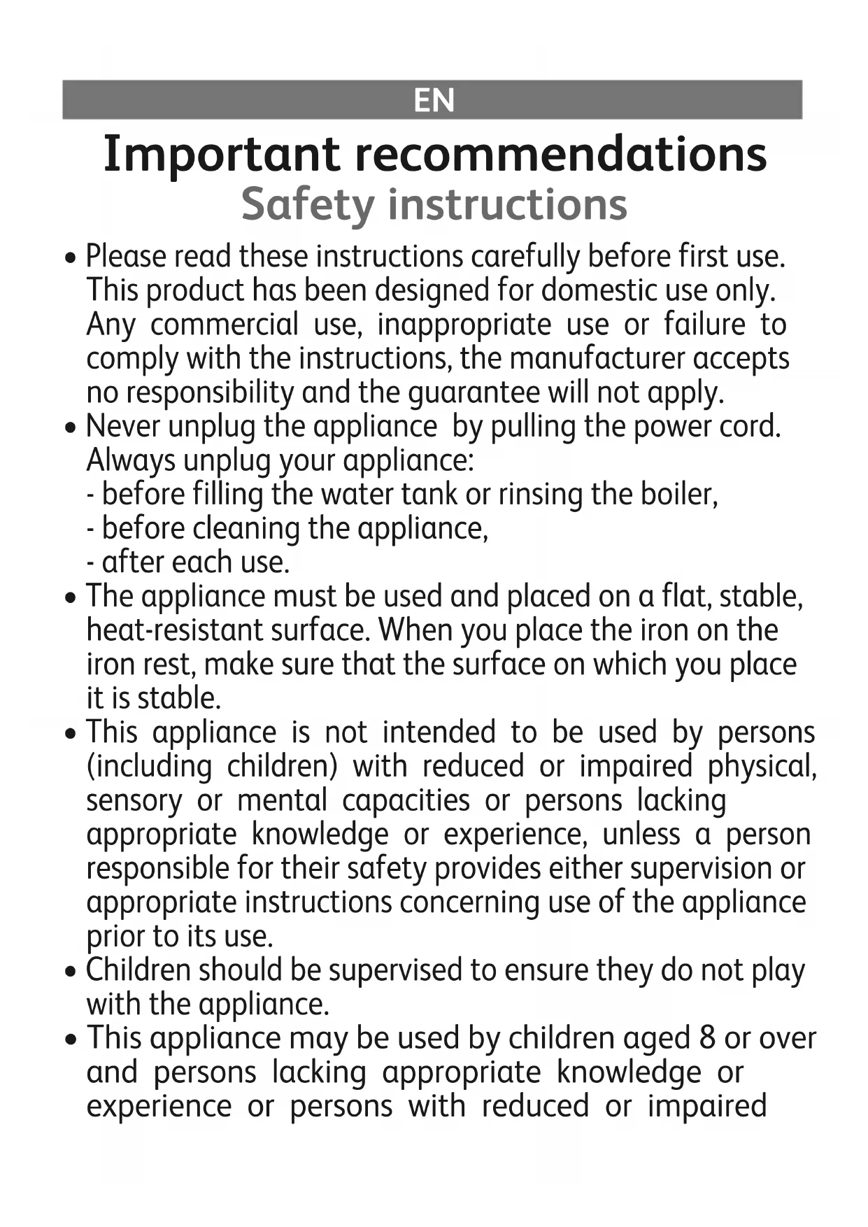 - Your steam generator iron is an electrical appliance: it must be used under normal conditions of use. It is designed for domestic use only.