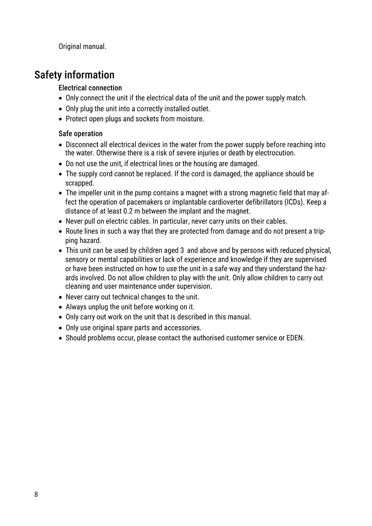 - Disconnect all electrical devices in the water from the power supply before reaching into the water. Otherwise there is a risk of severe injuries or death by electrocution.