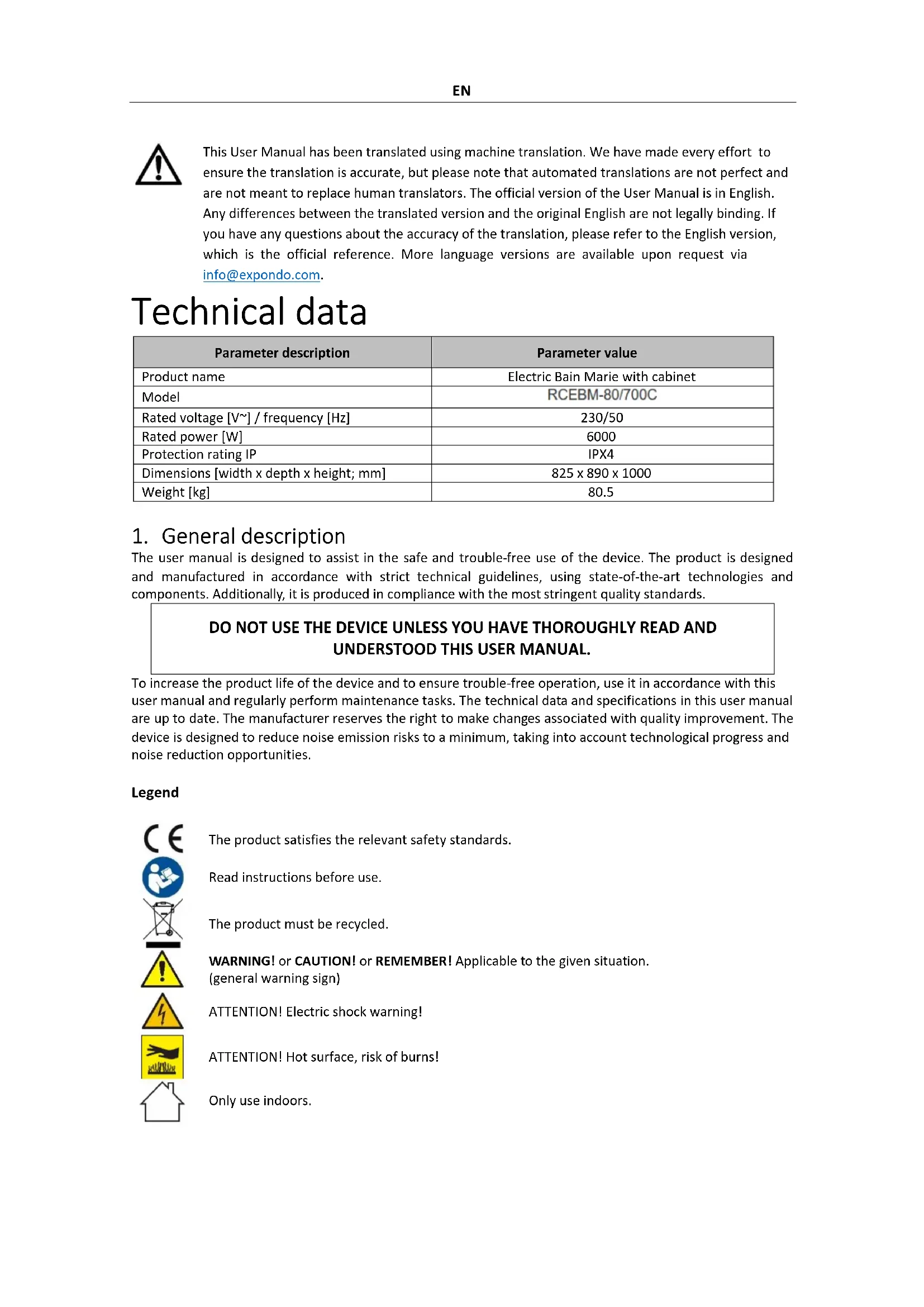 This User Manual has been translated using machine translation. We have made every effort to ensure the translation is accurate, but please note that automated translations are not perfect and are not meant to replace human translators. The official version of the User Manual is in English. Any differences between the translated version and the original English are not legally binding. If you have any questions about the accuracy of the translation, please refer to the English version, which is the official reference. More language versions are available upon request via info@expondo.com. Technical data Parameter description Parameter value Product name Electric Bain Marie with cabinet Model