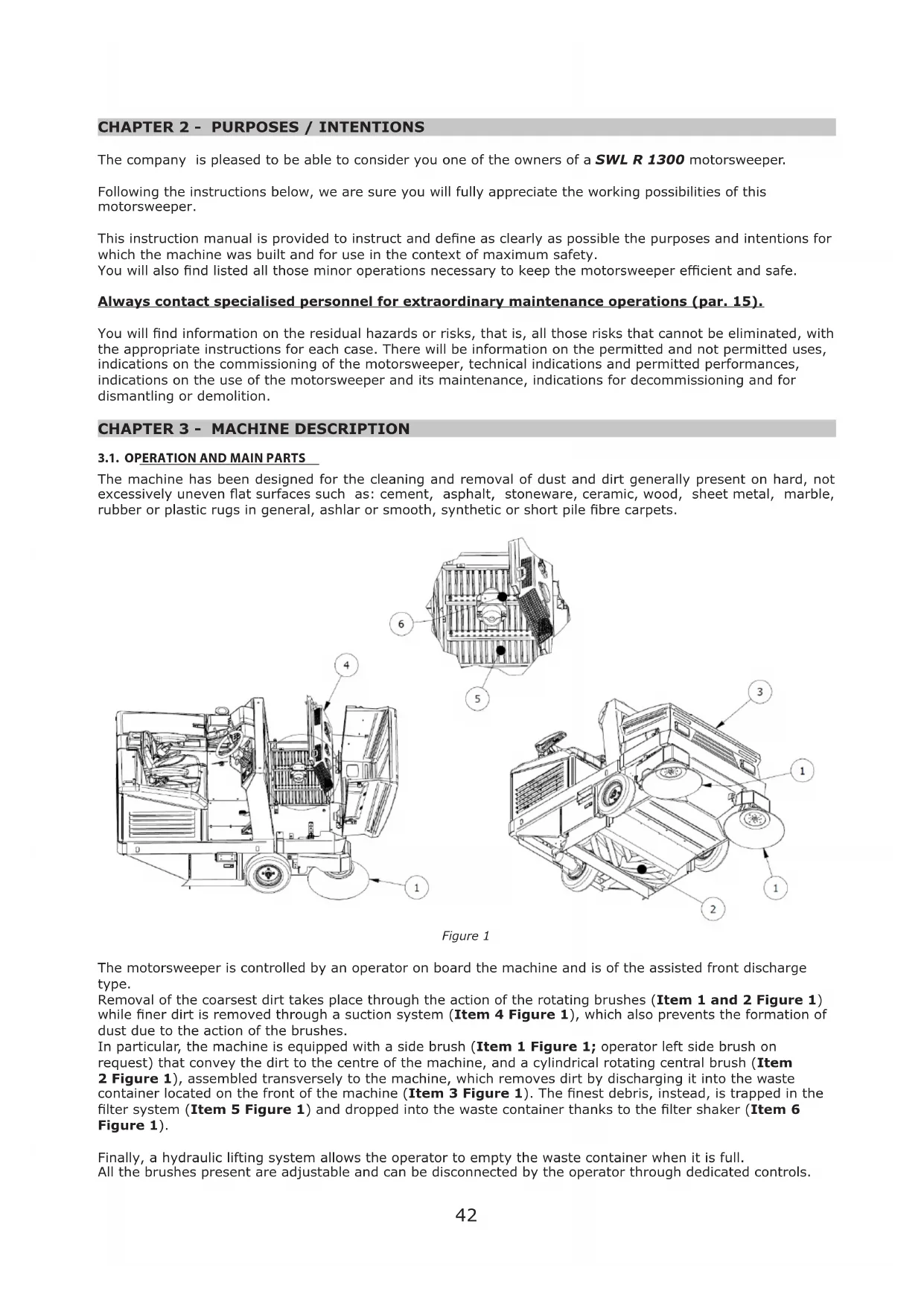 The machine has been designed for the cleaning and removal of dust and dirt generally present on hard, not excessively uneven at surfaces such as: cement, asphalt, stoneware, ceramic, wood, sheet metal, marble, rubber or plastic rugs in general, ashlar or smooth, synthetic or short pile bre carpets. Figure 1 The motorsweeper is controlled by an operator on board the machine and is of the assisted front discharge type. Removal of the coarsest dirt takes place through the action of the rotating brushes (Item 1 and 2 Figure 1) while ner dirt is removed through a suction system (Item 4 Figure 1), which also prevents the formation of dust due to the action of the brushes. In particular, the machine is equipped with a side brush (Item 1 Figure 1; operator left side brush on request) that convey the dirt to the centre of the machine, and a cylindrical rotating central brush (Item 2 Figure 1), assembled transversely to the machine, which removes dirt by discharging it into the waste container located on the front of the machine (Item 3 Figure 1). The nest debris, instead, is trapped in the lter system (Item 5 Figure 1) and dropped into the waste container thanks to the lter shaker (Item 6 Figure 1). Finally, a hydraulic lifting system allows the operator to empty the waste container when it is full. All the brushes present are adjustable and can be disconnected by the operator through dedicated controls.43