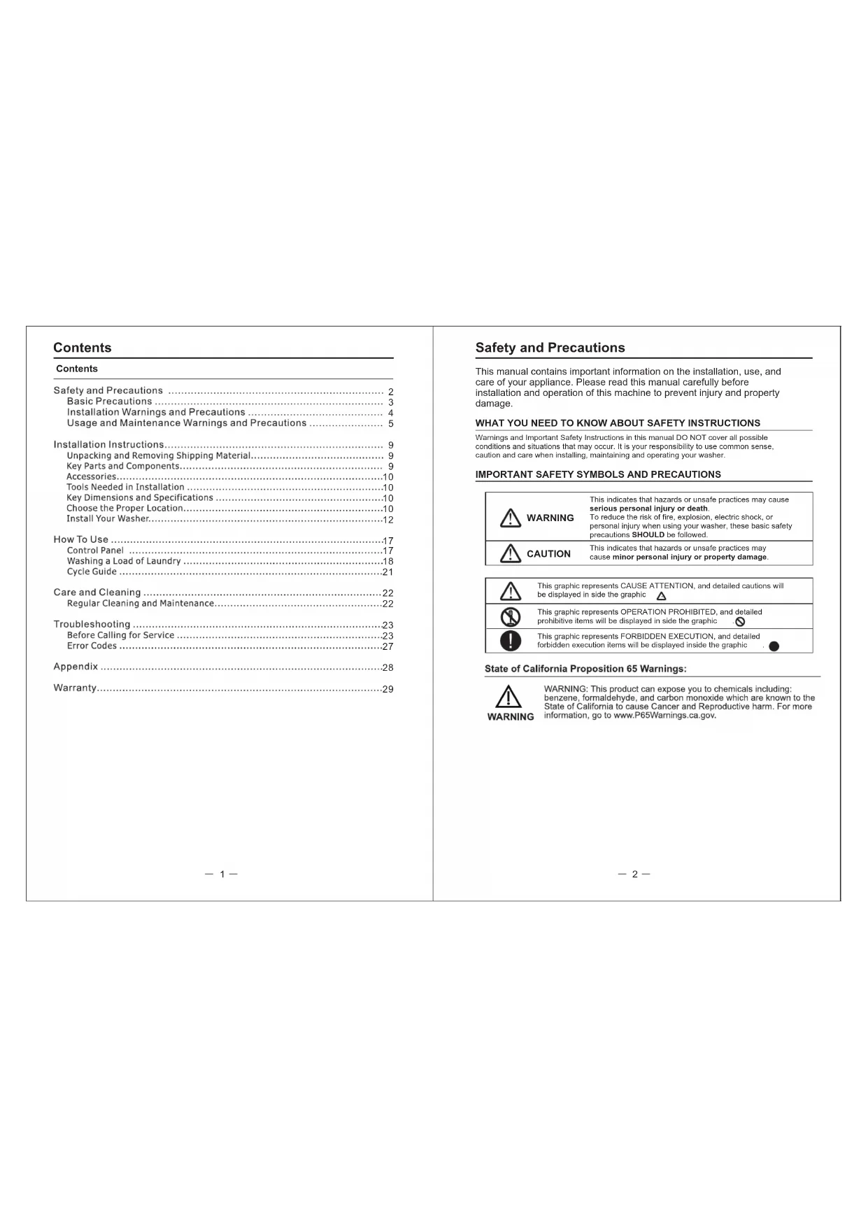 Safety and Precautions This manual contains important information on the installation, use, and care of your appliance. Please read this manual carefully before installation and operation of this machine to prevent injury and property damage. WHAT YOU NEED TO KNOW ABOUT SAFETY INSTRUCTIONS Warnings and Important Safety Instructions in this manual DO NOT cover all possible conditions and situations that may occur. It is your responsibility to use common sense, caution and care when installing, maintaining and operating your washer.