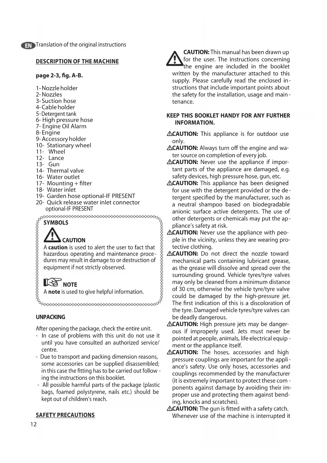 ing the instructions on this booklet. - All possible harmful parts of the package (plastic bags, foamed polystyrene, nails etc.) should be kept out of children’s reach. SAFETY PRECAUTIONS CAUTION: This manual has been drawn up for the user. The instructions concerning the engine are included in the booklet written by the manufacturer attached to this supply. Please carefully read the enclosed in