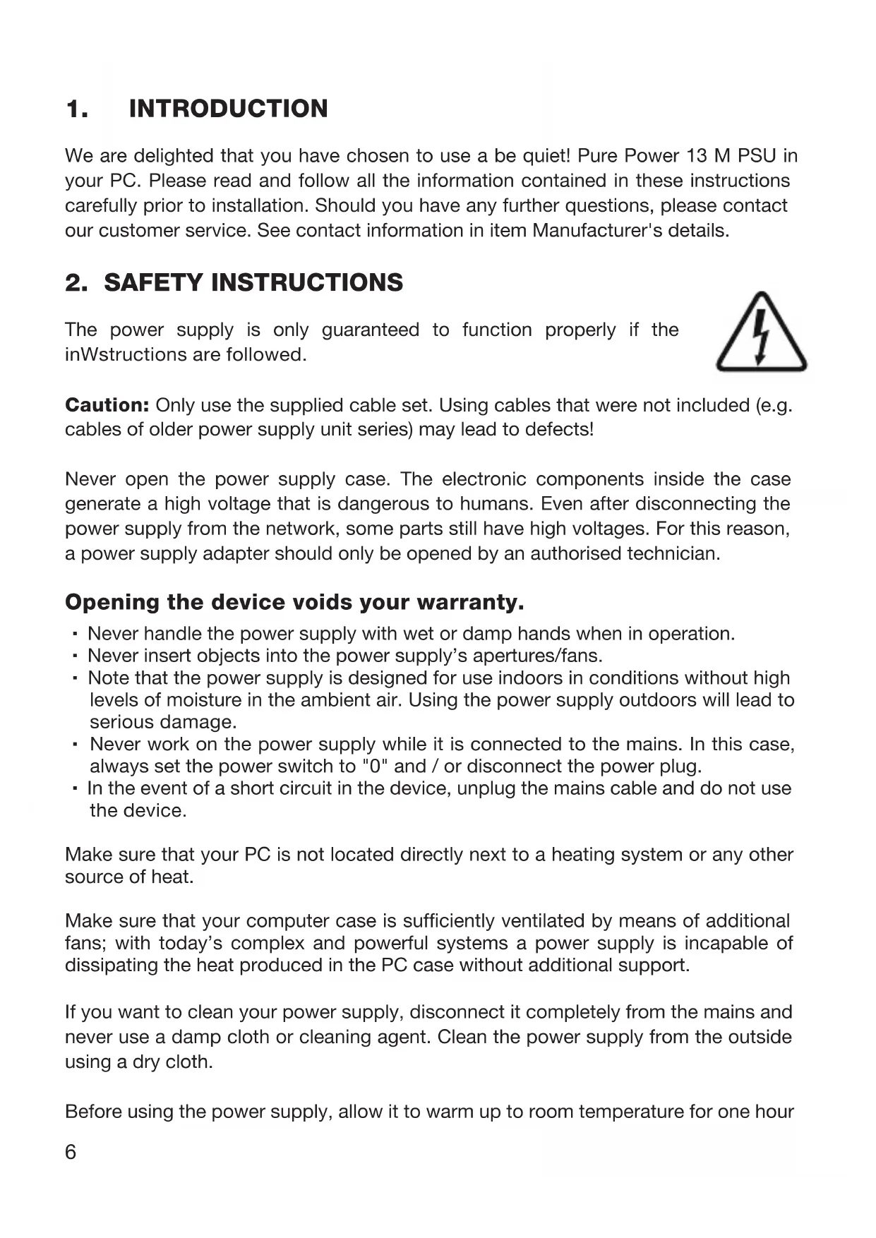The power supply is only guaranteed to function properly if the inWstructions are followed Caution: Only use the supplied cable set Using cables that were not included (eg cables of older power supply unit series) may lead to defects! Never open the power supply case The electronic components inside the case generate a high voltage that is dangerous to humans Even after disconnecting the power supply from the network, some parts still have high voltages For this reason, a power supply adapter should only be opened by an authorised technician Opening the device voids your warranty. ∙ Never handle the power supply with wet or damp hands when in operation ∙ Never insert objects into the power supply’s apertures/fans ∙ Note that the power supply is designed for use indoors in conditions without high levels of moisture in the ambient air Using the power supply outdoors will lead to serious damage ∙ Never work on the power supply while it is connected to the mains In this case, always set the power switch to "0" and / or disconnect the power plug ∙ In the event of a short circuit in the device, unplug the mains cable and do not use the device Make sure that your PC is not located directly next to a heating system or any other source of heat Make sure that your computer case is sufficiently ventilated by means of additional fans; with today’s complex and powerful systems a power supply is incapable of dissipating the heat produced in the PC case without additional support If you want to clean your power supply, disconnect it completely from the mains and never use a damp cloth or cleaning agent Clean the power supply from the outside using a dry cloth Before using the power supply, allow it to warm up to room temperature for one hour