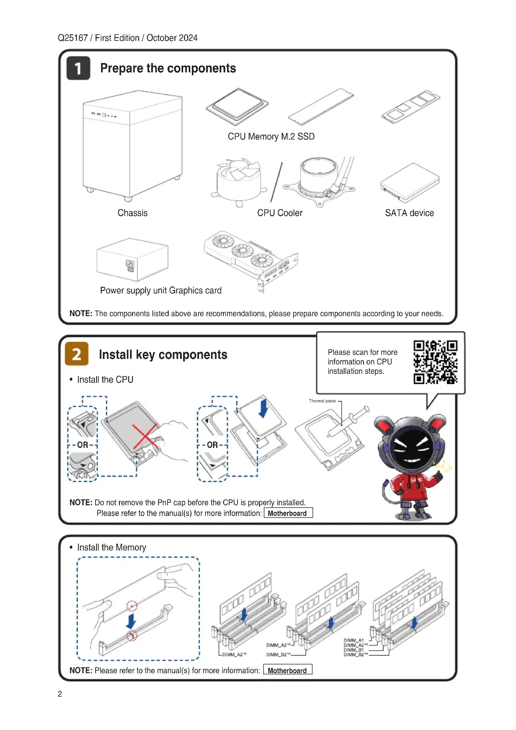 - Install the CPU NOTE: Do not remove the PnP cap before the CPU is properly installed. Thermal paste OROR Please refer to the manual(s) for more information: Motherboard Please scan for more information on CPU installation steps.3