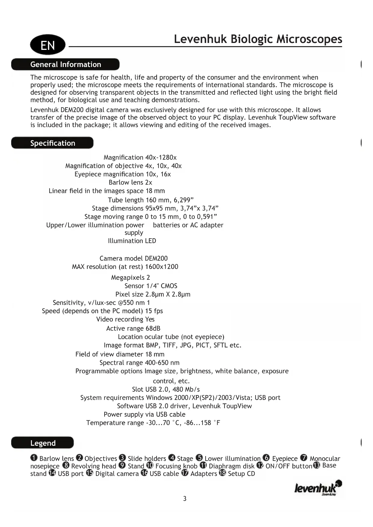 General Information The microscope is safe for health, life and property of the consumer and the environment when properly used; the microscope meets the requirements of international standards. The microscope is designed for observing transparent objects in the transmitted and reected light using the bright eld method, for biological use and teaching demonstrations. Levenhuk DEM200 digital camera was exclusively designed for use with this microscope. It allows transfer of the precise image of the observed object to your PC display. Levenhuk ToupView software is included in the package; it allows viewing and editing of the received images. Specication Magnication 40x-1280x Magnication of objective 4x, 10x, 40x Eyepiece magnication 10x, 16х Barlow lens 2x Linear eld in the images space 18 mm Tube length 160 mm, 6,299” Stage dimensions 95x95 mm, 3,74”x 3,74” Stage moving range 0 to 15 mm, 0 to 0,591” Upper/Lower illumination power supply batteries or AC adapter Illumination LED Camera model DEM200 MAX resolution (at rest) 1600x1200 Megapixels 2 Sensor 1/4" CMOS Pixel size 2.8μm X 2.8μm Sensitivity, v/lux-sec @550 nm 1 Speed (depends on the PC model) 15 fps Video recording Yes Active range 68dB Location ocular tube (not eyepiece) Image format BMP, TIFF, JPG, PICT, SFTL etc. Field of view diameter 18 mm Spectral range 400-650 nm Programmable options Image size, brightness, white balance, exposure control, etc. Slot USB 2.0, 480 Mb/s System requirements Windows 2000/XP(SP2)/2003/Vista; USB port Software USB 2.0 driver, Levenhuk ToupView Power supply via USB cable Temperature range -30...70 °C, -86...158 °F