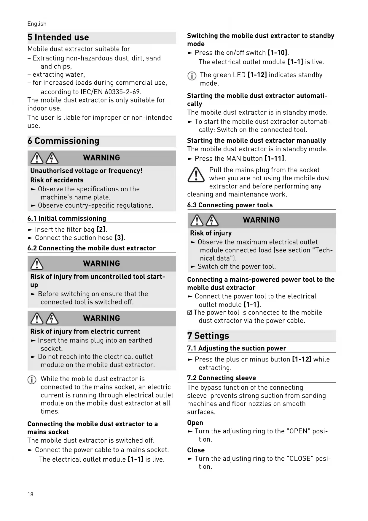 WARNING Risk of injury from electric current ► Insert the mains plug into an earthed socket. ► Do not reach into the electrical outlet module on the mobile dust extractor. While the mobile dust extractor is connected to the mains socket, an electric current is running through electrical outlet module on the mobile dust extractor at all times. Connecting the mobile dust extractor to a mains socket The mobile dust extractor is switched off. ► Connect the power cable to a mains socket. The electrical outlet module[1-1] is live. Switching the mobile dust extractor to standby mode ► Press the on/off switch[1-10]. The electrical outlet module[1-1] is live. The green LED[1-12] indicates standby mode. Starting the mobile dust extractor automati cally The mobile dust extractor is in standby mode. ► To start the mobile dust extractor automati cally: Switch on the connected tool. Starting the mobile dust extractor manually The mobile dust extractor is in standby mode. ► Press the MAN button [1-11]. Pull the mains plug from the socket when you are not using the mobile dust extractor and before performing any cleaning and maintenance work.
