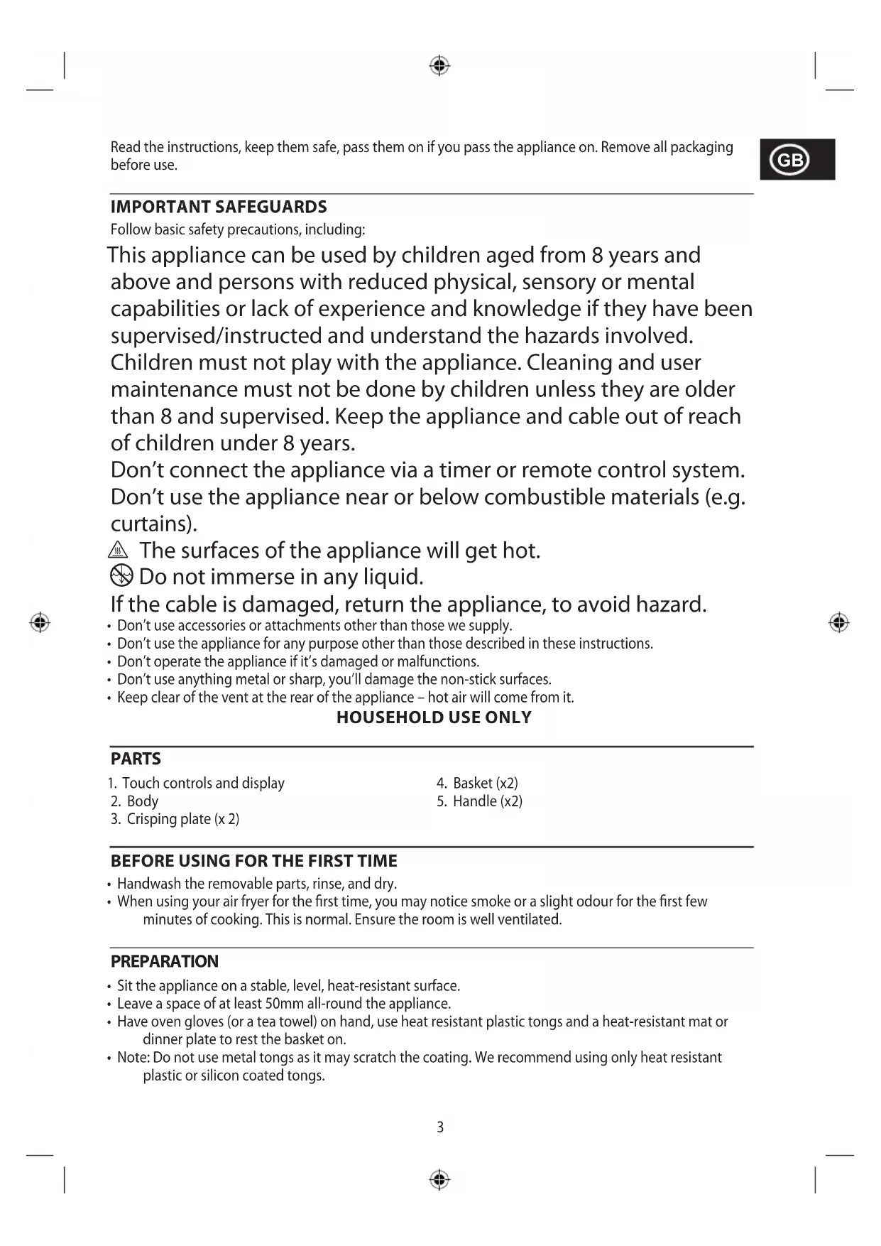 Read the instructions, keep them safe, pass them on if you pass the appliance on. Remove all packaging before use. IMPORTANT SAFEGUARDS Follow basic safety precautions, including: This appliance can be used by children aged from 8 years and above and persons with reduced physical, sensory or mental capabilities or lack of experience and knowledge if they have been supervised/instructed and understand the hazards involved. Children must not play with the appliance. Cleaning and user maintenance must not be done by children unless they are older than 8 and supervised. Keep the appliance and cable out of reach of children under 8 years. Don’t connect the appliance via a timer or remote control system. Don’t use the appliance near or below combustible materials (e.g. curtains). ¬ The surfaces of the appliance will get hot. i Do not immerse in any liquid. If the cable is damaged, return the appliance, to avoid hazard.