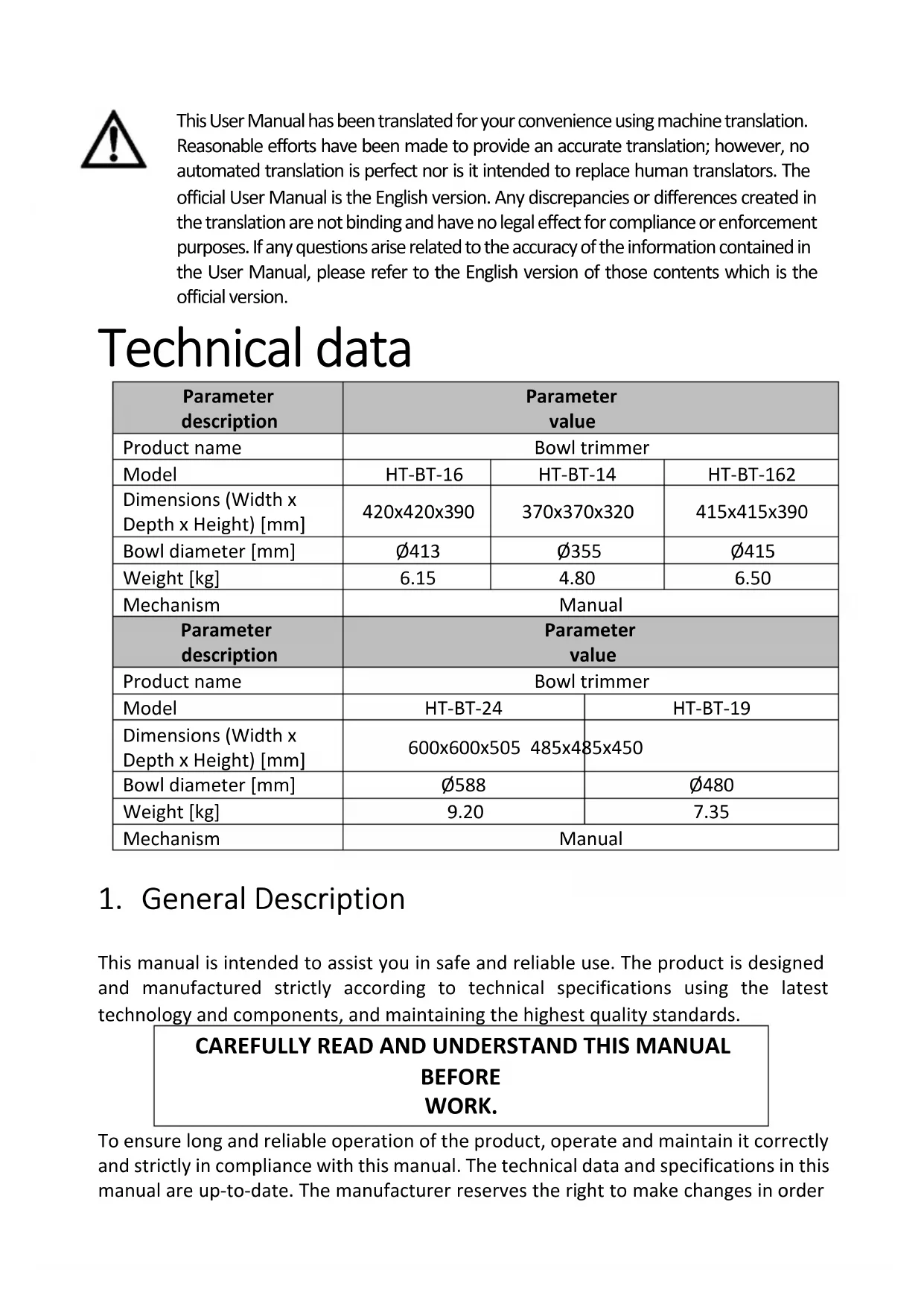 BEFORE WORK. To ensure long and reliable operation of the product, operate and maintain it correctly and strictly in compliance with this manual. The technical data and specifications in this manual are up-to-date. The manufacturer reserves the right to make changes in order This User Manual has been translated for your convenience using machine translation. Reasonable efforts have been made to provide an accurate translation; however, no automated translation is perfect nor is it intended to replace human translators. The official User Manual is the English version. Any discrepancies or differences created in the translation are not binding and have no legal effect for compliance or enforcement purposes. If any questions arise related to the accuracy of the information contained in the User Manual, please refer to the English version of those contents which is the official version.to improve the quality. Taking the technical progress and the possibility of reducing noise into account, the unit is designed and built in such a way so that risks resulting from noise emissions are reduced to the lowest possible level. Explanation of symbols