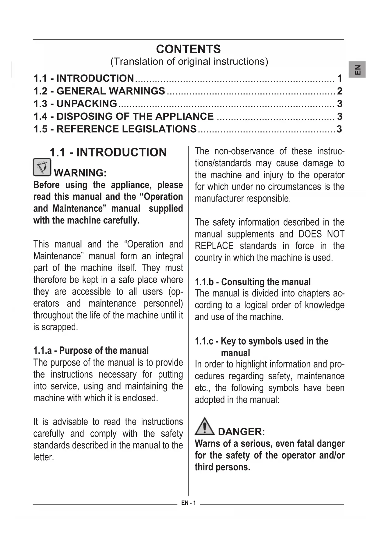 Before using the appliance, please read this manual and the “Operation and Maintenance” manual supplied with the machine carefully. This manual and the “Operation and Maintenance” manual form an integral part of the machine itself. They must therefore be kept in a safe place where they are accessible to all users (op- erators and maintenance personnel) throughout the life of the machine until it is scrapped.