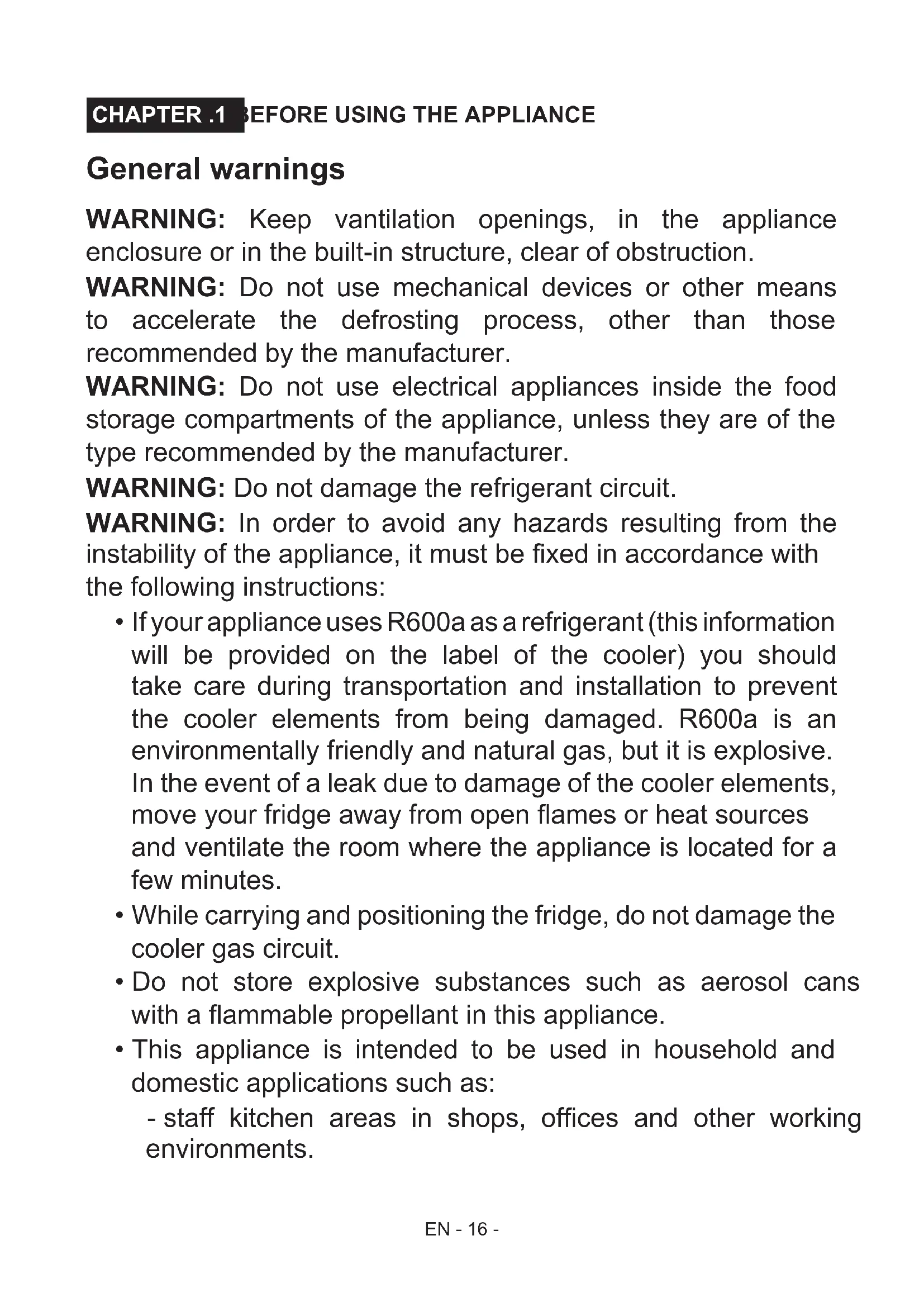 - This appliance is intended to be used in household and domestic applications such as: - staff kitchen areas in shops, ofces and other working environments.EN - 17 - - farm houses and by clients in hotels, motels and other residential type environments. - bed and breakfast type environments; - catering and similar non-retail applications.