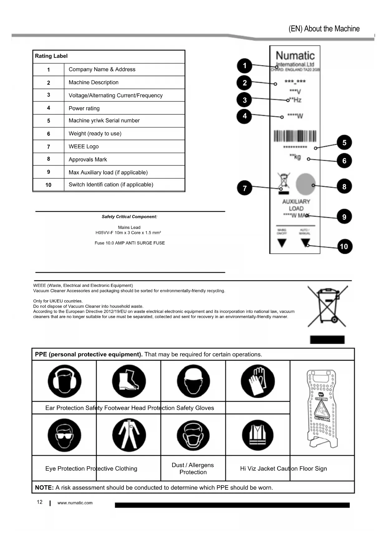 Changing / Replacing Cable, Auswechseln des Kabels, Changement/remplacement du câble, Vervangen van de kabel, Mudar/substituir cabo, Cambio/sostituzione del cavo, Cambio del cable, Zmiana / Wymiana kabla12 www.numatic.comSafety Critical Component:Mains LeadH05VV-F 10m x 3 Core x 1.5 mm² Fuse 10.0 AMP ANTI SURGE FUSEWEEE (Waste, Electrical and Electronic Equipment)Vacuum Cleaner Accessories and packaging should be sorted for environmentally-friendly recycling.Only for UK/EU countries.Do not dispose of Vacuum Cleaner into household waste. According to the European Directive 2012/19/EU on waste electrical electronic equipment and its incorporation into national law, vacuum cleaners that are no longer suitable for use must be separated, collected and sent for recovery in an environmentally-friendly manner. Rating Label