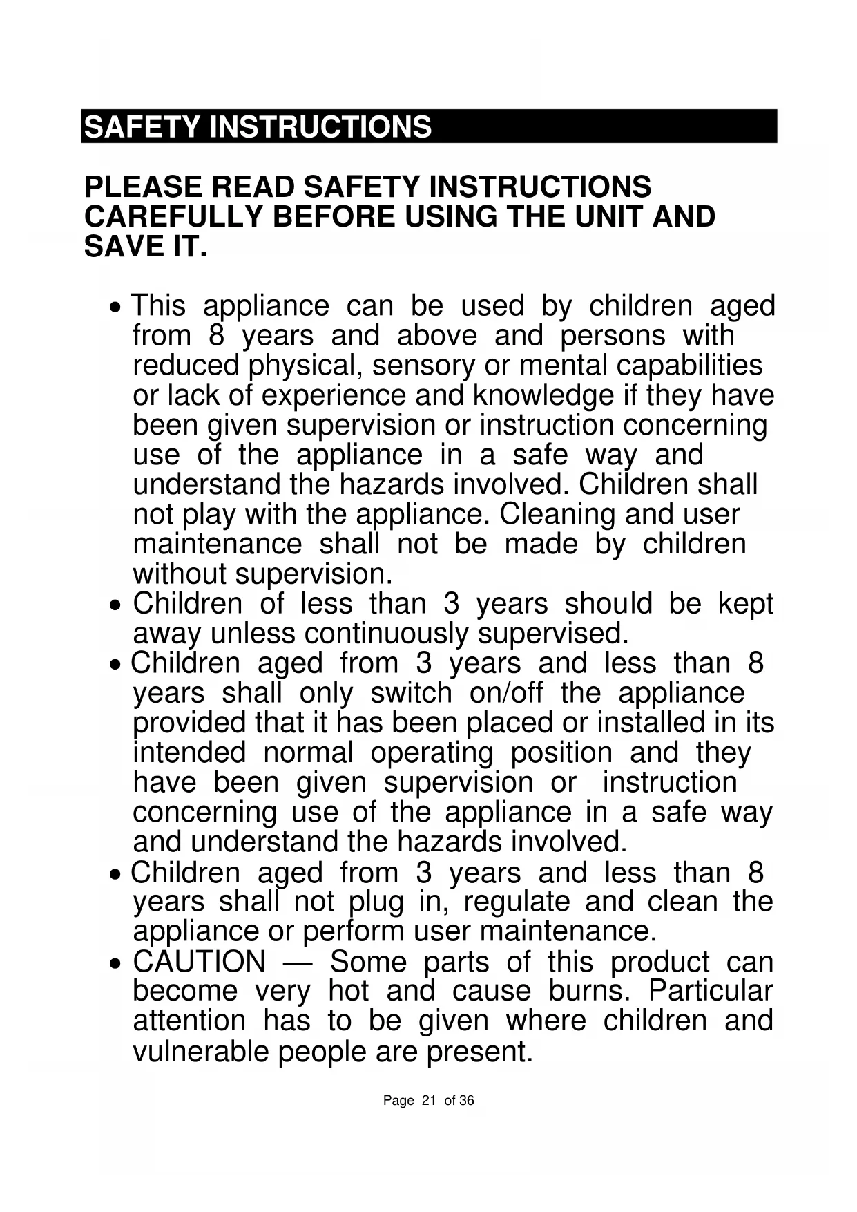 - Children aged from 3 years and less than 8 years shall not plug in, regulate and clean the appliance or perform user maintenance.