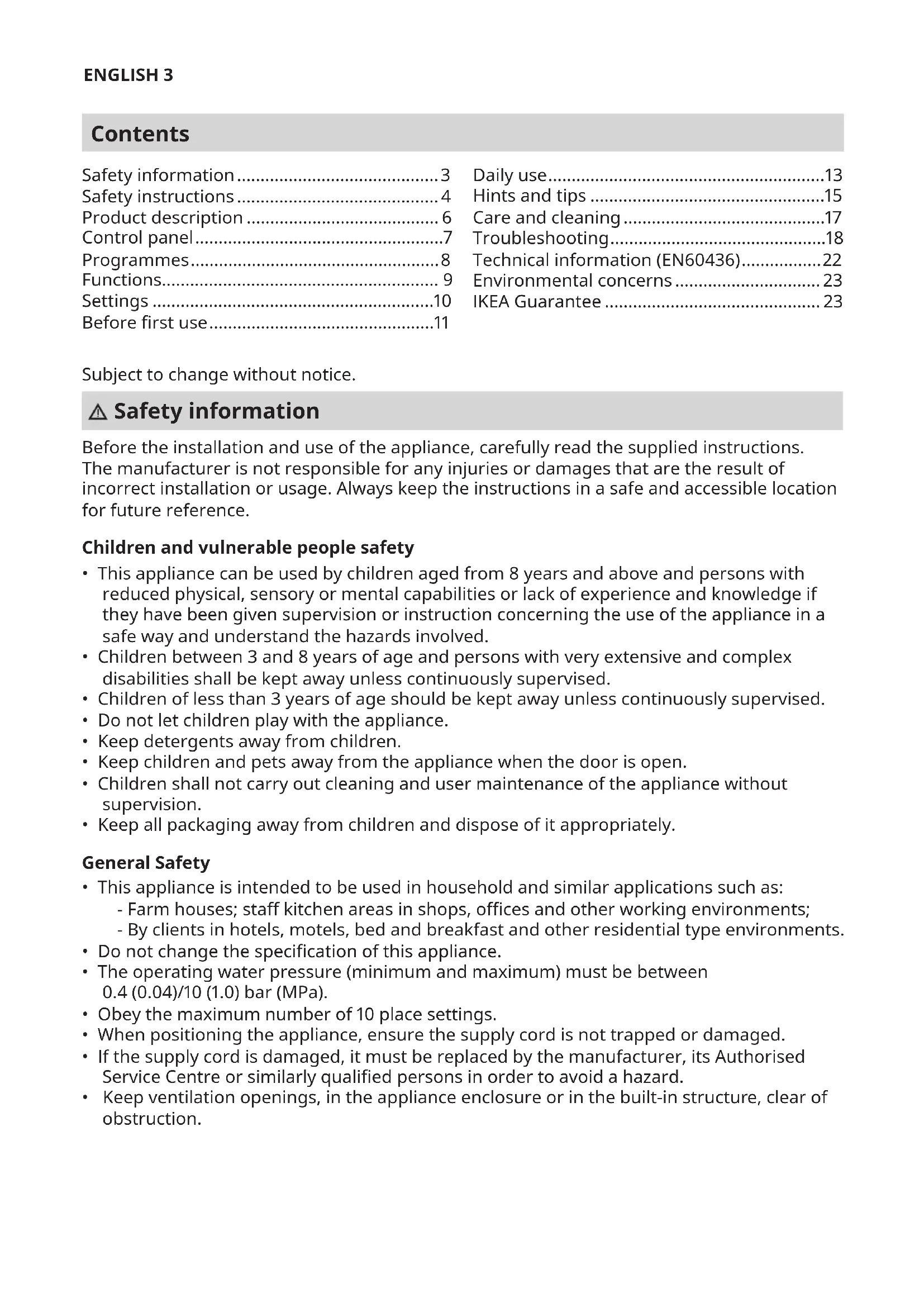 - Keep ventilation openings, in the appliance enclosure or in the built-in structure, clear of obstruction. Safety information ........................................... 3 Safety instructions ........................................... 4 Product description ......................................... 6 Control panel .....................................................7 Programmes ..................................................... 8 Functions........................................................... 9 Settings ............................................................10 Before rst use ................................................11 Daily use ...........................................................13 Hints and tips ..................................................15 Care and cleaning ...........................................17 Troubleshooting ..............................................18 Technical information (EN60436) ................. 22 Environmental concerns ............................... 23 IKEA Guarantee .............................................. 23ENGLISH 4