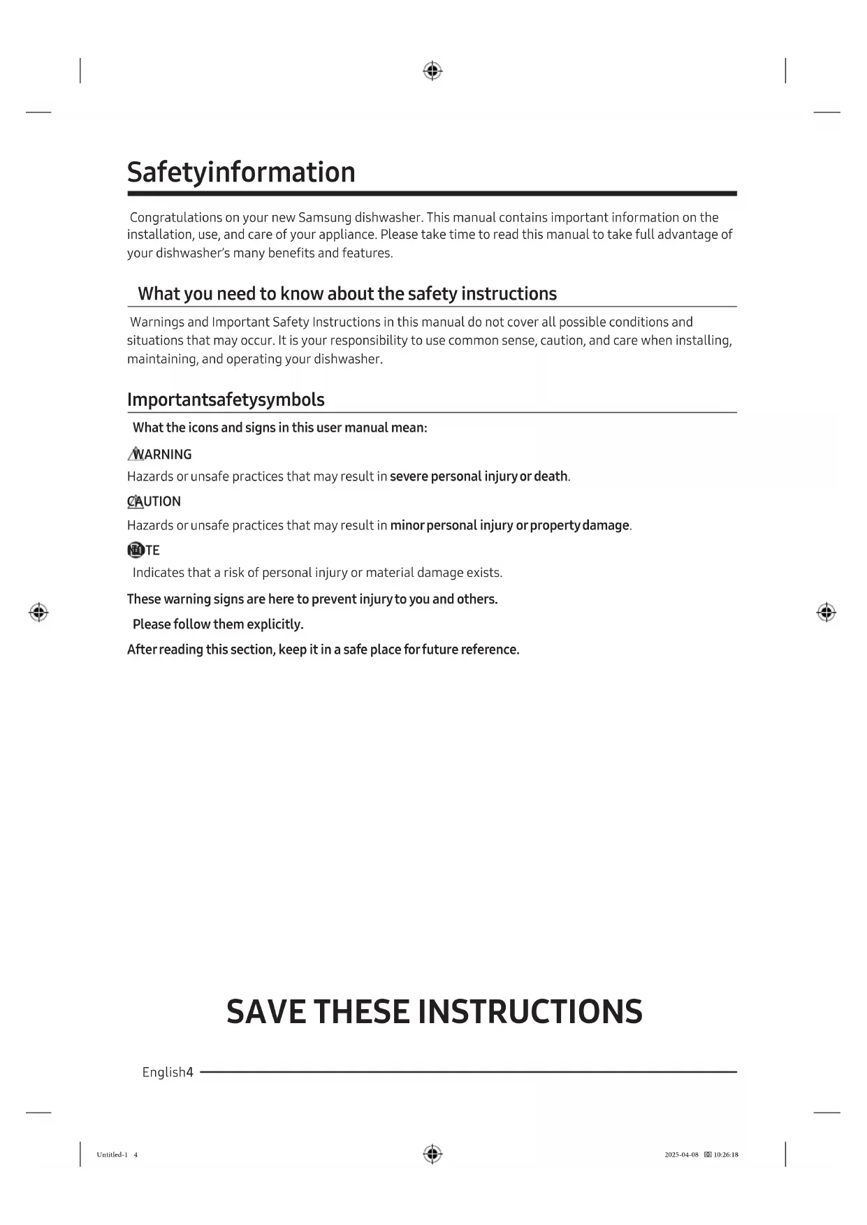 Cycle chart 53 Helping the environment 55 Specifications 55 Warranty 56 Warranty (U.S.A) 56 Warranty (CANADA) 59 Untitled-1 3Untitled-1 3 2025-04-08 10:26:172025-04-08 10:26:17SAVE THESE INSTRUCTIONS English4 Safety information Congratulations on your new Samsung dishwasher. This manual contains important information on the installation, use, and care of your appliance. Please take time to read this manual to take full advantage of your dishwasher’s many benefits and features. What you need to know about the safety instructions Warnings and Important Safety Instructions in this manual do not cover all possible conditions and situations that may occur. It is your responsibility to use common sense, caution, and care when installing, maintaining, and operating your dishwasher. Important safety symbols What the icons and signs in this user manual mean: WARNING Hazards or unsafe practices that may result in severe personal injury or death. CAUTION Hazards or unsafe practices that may result in minor personal injury or property damage. NOTE Indicates that a risk of personal injury or material damage exists. These warning signs are here to prevent injury to you and others. Please follow them explicitly. After reading this section, keep it in a safe place for future reference. Untitled-1 4Untitled-1 4 2025-04-08 10:26:182025-04-08 10:26:18SAVE THESE INSTRUCTIONS English 5 California Proposition 65 Warning WARNING Cancer and Reproductive Harm - www.P65Warnings.ca.gov Important safety instructions WARNING When using your dishwasher, follow basic precautions, including the following: