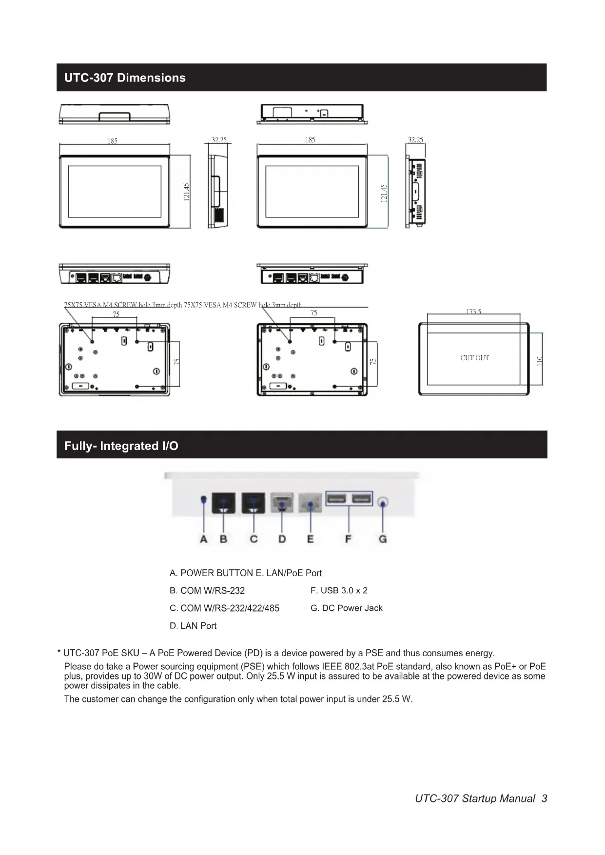 - UTC-307 PoE SKU – A PoE Powered Device (PD) is a device powered by a PSE and thus consumes energy. Please do take a Power sourcing equipment (PSE) which follows IEEE 802.3at PoE standard, also known as PoE+ or PoE plus, provides up to 30W of DC power output. Only 25.5 W input is assured to be available at the powered device as some power dissipates in the cable. Thecustomercanchangethecongurationonlywhentotalpowerinputisunder25.5W.