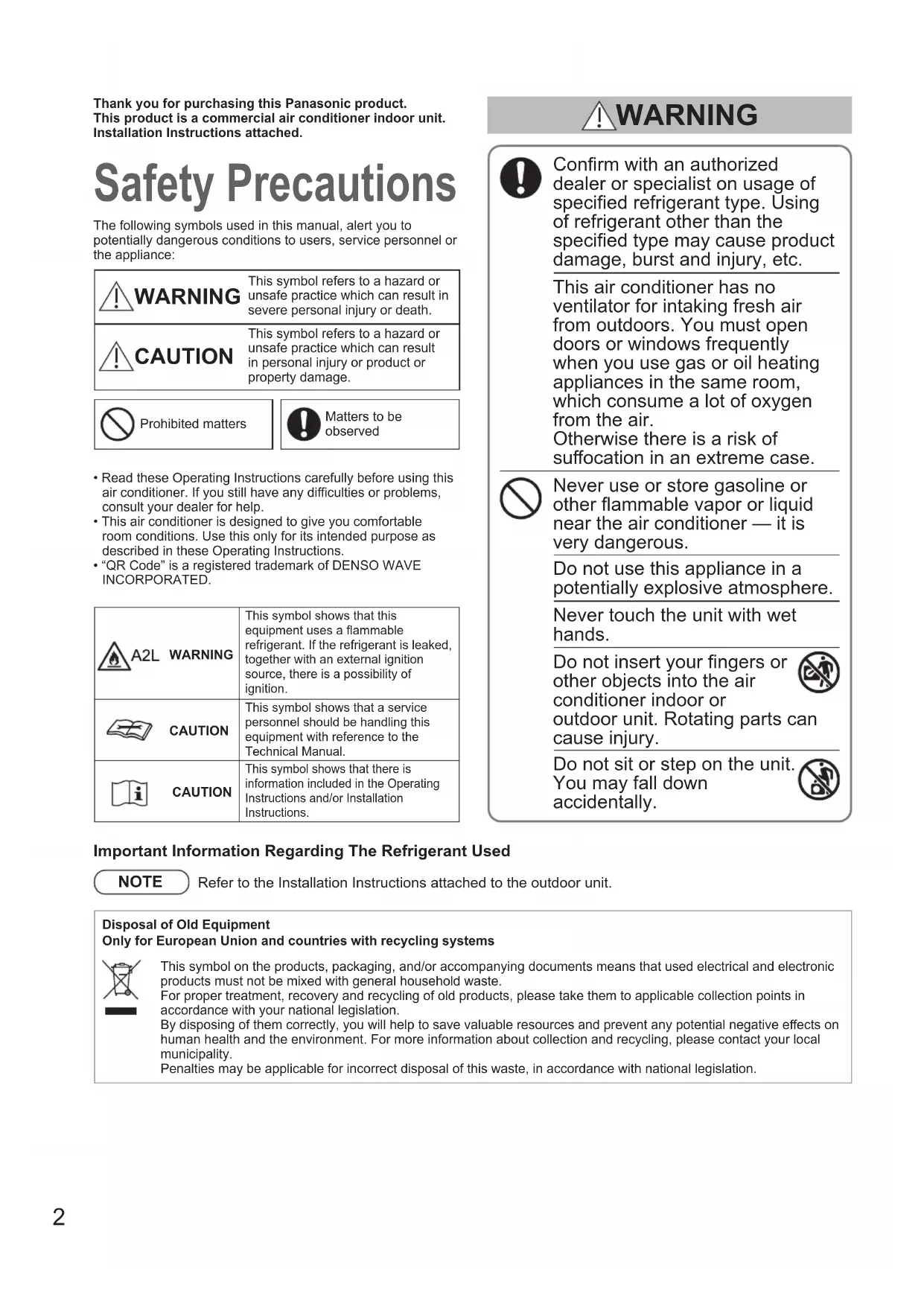 4-Way Cassette Model No.TÜRKÇE БЪЛГАРСКИ ΕΛΛΗΝΙΚΆ PORTUGUÊSNEDERLANDSITALIANO DEUTSCH ESPAÑOL FRANÇAIS ENGLISHA 00_360661_all.indb 100_360661_all.indb 1 2024/10/07 17:19:252024/10/07 17:19:252 Thank you for purchasing this Panasonic product.This product is a commercial air conditioner indoor unit.Installation Instructions attached. Safety Precautions The following symbols used in this manual, alert you to potentially dangerous conditions to users, service personnel or the appliance: WARNING This symbol refers to a hazard or unsafe practice which can result in severe personal injury or death. CAUTION This symbol refers to a hazard or unsafe practice which can result in personal injury or product or property damage.Prohibited mattersMatters to be observed• Read these Operating Instructions carefully before using this air conditioner. If you still have any diculties or problems, consult your dealer for help.• This air conditioner is designed to give you comfortable room conditions. Use this only for its intended purpose as described in these Operating Instructions.• “QR Code” is a registered trademark of DENSO WAVE INCORPORATED. Conrm with an authorized dealer or specialist on usage of specied refrigerant type. Using of refrigerant other than the specied type may cause product damage, burst and injury, etc. This air conditioner has no ventilator for intaking fresh air from outdoors. You must open doors or windows frequently when you use gas or oil heating appliances in the same room, which consume a lot of oxygen from the air. Otherwise there is a risk of suocation in an extreme case. Never use or store gasoline or other ammable vapor or liquid near the air conditioner — it is very dangerous. Do not use this appliance in a potentially explosive atmosphere. Never touch the unit with wet hands. Do not insert your ngers or other objects into the air conditioner indoor or outdoor unit. Rotating parts can cause injury. Do not sit or step on the unit. You may fall down accidentally. WARNING WARNINGThis symbol shows that this equipment uses a flammable refrigerant. If the refrigerant is leaked, together with an external ignition source, there is a possibility of ignition.CAUTIONThis symbol shows that a service personnel should be handling this equipment with reference to the Technical Manual.CAUTIONThis symbol shows that there is information included in the Operating Instructions and/or Installation Instructions.Important Information Regarding The Refrigerant Used NOTE Refer to the Installation Instructions attached to the outdoor unit.Disposal of Old EquipmentOnly for European Union and countries with recycling systemsThis symbol on the products, packaging, and/or accompanying documents means that used electrical and electronic products must not be mixed with general household waste.For proper treatment, recovery and recycling of old products, please take them to applicable collection points in accordance with your national legislation.By disposing of them correctly, you will help to save valuable resources and prevent any potential negative eects on human health and the environment. For more information about collection and recycling, please contact your local municipality.Penalties may be applicable for incorrect disposal of this waste, in accordance with national legislation. 00_360661_all.indb 200_360661_all.indb 2 2024/10/07 17:19:262024/10/07 17:19:263 ENGLISH If the refrigerant comes in contact with a ame, it produces toxic gases. For safety, be sure to turn the air conditioner o and also to disconnect the power before cleaning or servicing. Pull o the power plug from a receptacle, or switch o the breaker, or switch o the power disconnecting mean to isolate the air conditioner from the main power supply in case of emergency. Dispose of according to national and/or local legislation. This product must not be modied or disassembled under any circumstances. Modied or disassembled unit may cause re, electric shock or injury. Do not clean inside the indoor and outdoor units by users. Engage authorized dealer or specialist for cleaning. In case of malfunction of this appliance, do not repair by yourself. Contact the sales dealer or service dealer for a repair and disposal. Provide a power outlet to be used exclusively for each unit, and a power supply disconnect, Earth Leakage Circuit Breaker (ELCB) or Residual Current Device (RCD) for overcurrent protection should be provided in the exclusive line. Provide a power outlet exclusively for each unit, and full disconnection means having a contact separation in all poles must be incorporated in the xed wiring in accordance with the wiring rules. To prevent possible hazards from insulation failure, the unit must be grounded. WARNING Do not use modied cord, joint cord, extension cord or unspecied cord to prevent overheating and re. The appliance shall be stored in a room without continuously operating ignition sources (for example: open ames, an operating gas appliance or an operating electric heater). Be aware that refrigerants may not contain an odour. An unventilated area where the appliance is installed shall be so constructed that should any refrigerant leak, it will not stagnate so as to create a re or explosion hazard. The appliance shall be stored in an area where the room size corresponds to the room area as specied for operation. After the unit is installed, never fail to ask the installer for the oor space of the room where the unit is installed and the refrigerant charge amount. In case the unit or the room divider is changed, never fail to consult the sales dealer or service dealer. Do not use means to accelerate the defrosting process or to clean, other than those recommended by the manufacturer. Do not pierce or burn. The appliance shall be stored in a room without continuously operating open ames (for example: an operating gas appliance) and ignition sources (for example: an operating electric heater).