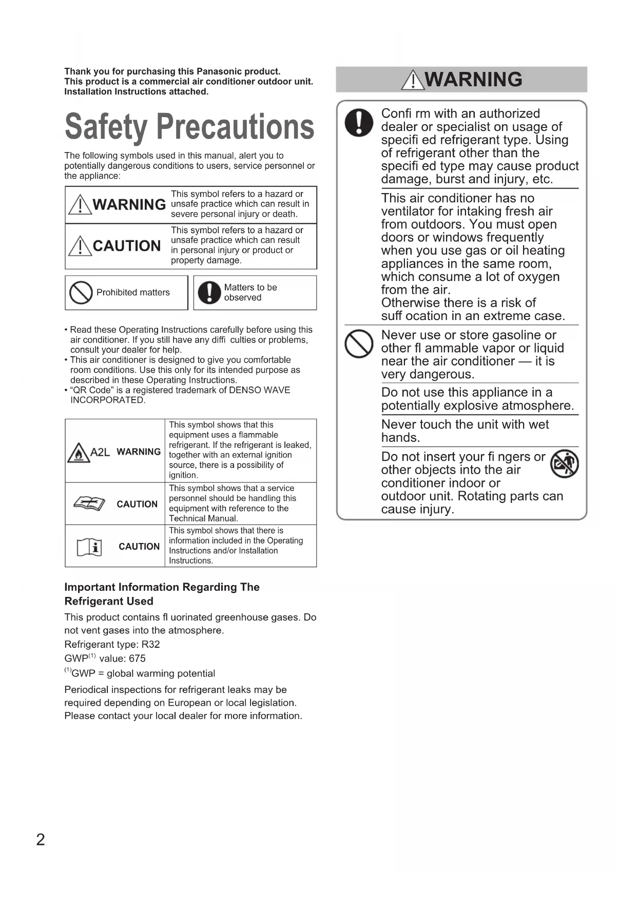 47 ~ 51 Üniteyi çalıştırmadan önce bu çalıştırma talimatlarını dikkatlice okuyun ve daha sonra başvurmak üzere saklayın. Bu kitapçıkta temel olarak güvenlikle ilgili bilgiler ve mevzuat bilgileri açıklanmıştır. Çalıştırma ile ilgili açıklamalar için lütfen QR Kodunu taratın ve ayrıntılı kılavuzlara bakın. Specifi cations 52 ~ 54 Refrigerant type : R32 2WAY VRF (Type MZ1) Model No.U-8MZ1E8U-10MZ1E8U-12MZ1E8TÜRKÇE БЪЛГАРСКИ ΕΛΛΗΝΙΚΆ PORTUGUÊSNEDERLANDSITALIANO DEUTSCH ESPAÑOL FRANÇAIS ENGLISHOUTDOOR UNITACXF55-40230 00360620all.indb100360620all.indb1 2024/06/249:31:302024/06/249:31:302 Thank you for purchasing this Panasonic product.This product is a commercial air conditioner outdoor unit.Installation Instructions attached. Safety Precautions The following symbols used in this manual, alert you to potentially dangerous conditions to users, service personnel or the appliance: WARNING This symbol refers to a hazard or unsafe practice which can result in severe personal injury or death. CAUTION This symbol refers to a hazard or unsafe practice which can result in personal injury or product or property damage.Prohibited mattersMatters to be observed• Read these Operating Instructions carefully before using this air conditioner. If you still have any diffi culties or problems, consult your dealer for help.• This air conditioner is designed to give you comfortable room conditions. Use this only for its intended purpose as described in these Operating Instructions.• “QR Code” is a registered trademark of DENSO WAVE INCORPORATED. Confi rm with an authorized dealer or specialist on usage of specifi ed refrigerant type. Using of refrigerant other than the specifi ed type may cause product damage, burst and injury, etc. This air conditioner has no ventilator for intaking fresh air from outdoors. You must open doors or windows frequently when you use gas or oil heating appliances in the same room, which consume a lot of oxygen from the air. Otherwise there is a risk of suff ocation in an extreme case. Never use or store gasoline or other fl ammable vapor or liquid near the air conditioner — it is very dangerous. Do not use this appliance in a potentially explosive atmosphere. Never touch the unit with wet hands. Do not insert your fi ngers or other objects into the air conditioner indoor or outdoor unit. Rotating parts can cause injury. WARNING WARNINGThis symbol shows that this equipment uses a flammable refrigerant. If the refrigerant is leaked, together with an external ignition source, there is a possibility of ignition.CAUTIONThis symbol shows that a service personnel should be handling this equipment with reference to the Technical Manual.CAUTIONThis symbol shows that there is information included in the Operating Instructions and/or Installation Instructions.Important Information Regarding The Refrigerant UsedThis product contains fl uorinated greenhouse gases. Do not vent gases into the atmosphere.Refrigerant type: R32 GWP (1) value: 675 (1) GWP = global warming potentialPeriodical inspections for refrigerant leaks may be required depending on European or local legislation.Please contact your local dealer for more information. 00360620all.indb200360620all.indb2 2024/06/249:31:302024/06/249:31:303 ENGLISH If the refrigerant comes in contact with a fl ame, it produces toxic gases. For safety, be sure to turn the air conditioner off and also to disconnect the power before cleaning or servicing. Pull off the power plug from a receptacle, or switch off the breaker, or switch off the power disconnecting mean to isolate the air conditioner from the main power supply in case of emergency. Dispose of according to national and/or local legislation. This product must not be modifi ed or disassembled under any circumstances. Modifi ed or disassembled unit may cause fi re, electric shock or injury. Do not clean inside the indoor and outdoor units by users. Engage authorized dealer or specialist for cleaning. In case of malfunction of this appliance, do not repair by yourself. Contact the sales dealer or service dealer for a repair and disposal. Provide a power outlet to be used exclusively for each unit, and a power supply disconnect, Earth Leakage Circuit Breaker (ELCB) or Residual Current Device (RCD) for overcurrent protection should be provided in the exclusive line. Provide a power outlet exclusively for each unit, and full disconnection means having a contact separation in all poles must be incorporated in the fi xed wiring in accordance with the wiring rules. To prevent possible hazards from insulation failure, the unit must be grounded. WARNING Do not use modifi ed cord, joint cord, extension cord or unspecifi ed cord to prevent overheating and fi re. The appliance shall be stored in a room without continuously operating ignition sources (for example: open fl ames, an operating gas appliance or an operating electric heater). Be aware that refrigerants may not contain an odour. An unventilated area where the appliance is installed shall be so constructed that should any refrigerant leak, it will not stagnate so as to create a fi re or explosion hazard. The appliance shall be stored in an area where the room size corresponds to the room area as specifi ed for operation. After the unit is installed, never fail to ask the installer for the fl oor space of the room where the unit is installed and the refrigerant charge amount. In case the unit or the room divider is changed, never fail to consult the sales dealer or service dealer. Do not use means to accelerate the defrosting process or to clean, other than those recommended by the manufacturer. Do not pierce or burn. 00360620all.indb300360620all.indb3 2024/06/249:31:302024/06/249:31:304 WARNING Stop using the product when any abnormality/failure occurs and disconnect the power plug or turn off the power switch and breaker. (Risk of smoke/fi re/electric shock) Examples of abnormali