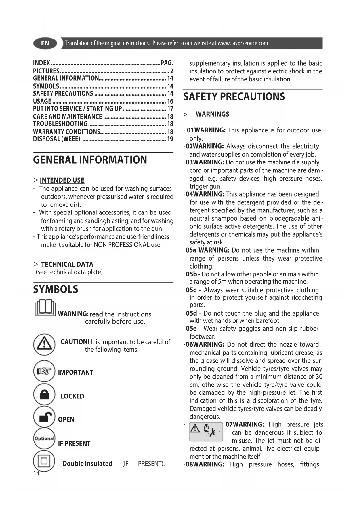 - 08WARNING: High pressure hoses, ttings GENERAL INFORMATION > INTENDED USE - The appliance can be used for washing surfaces outdoors, whenever pressurised water is required to remove dirt. - With special optional accessories, it can be used for foaming and sandingblasting, and for washing with a rotary brush for application to the gun. - This appliance’s performance and userfriendliness make it suitable for NON PROFESSIONAL use. > TECHNICAL DATA (see technical data plate) SYMBOLS