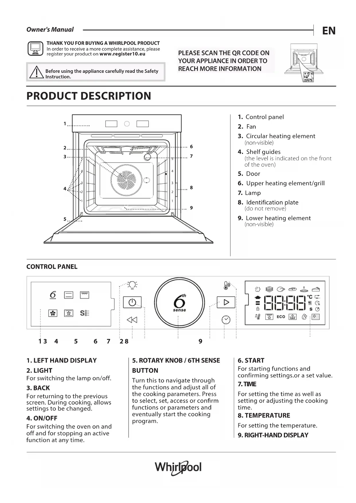Owner's Manual THANK YOU FOR BUYING A WHIRLPOOL PRODUCT In order to receive a more complete assistance, please register your product on www.register10.eu Before using the appliance carefully read the Safety Instruction. PRODUCT DESCRIPTION CONTROL PANEL