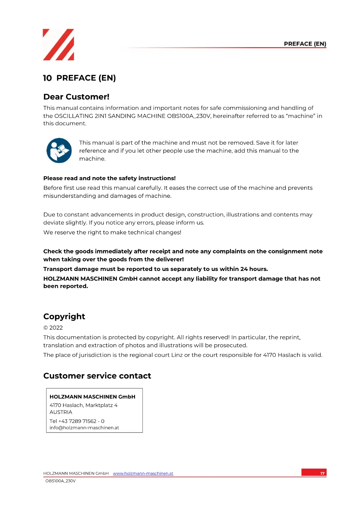 This manual is part of the machine and must not be removed. Save it for later reference and if you let other people use the machine, add this manual to the machine. Please read and note the safety instructions! Before first use read this manual carefully. It eases the correct use of the machine and prevents misunderstanding and damages of machine. Due to constant advancements in product design, construction, illustrations and contents may deviate slightly. If you notice any errors, please inform us. We reserve the right to make technical changes! Check the goods immediately after receipt and note any complaints on the consignment note when taking over the goods from the deliverer! Transport damage must be reported to us separately to us within 24 hours. HOLZMANN MASCHINEN GmbH cannot accept any liability for transport damage that has not been reported.