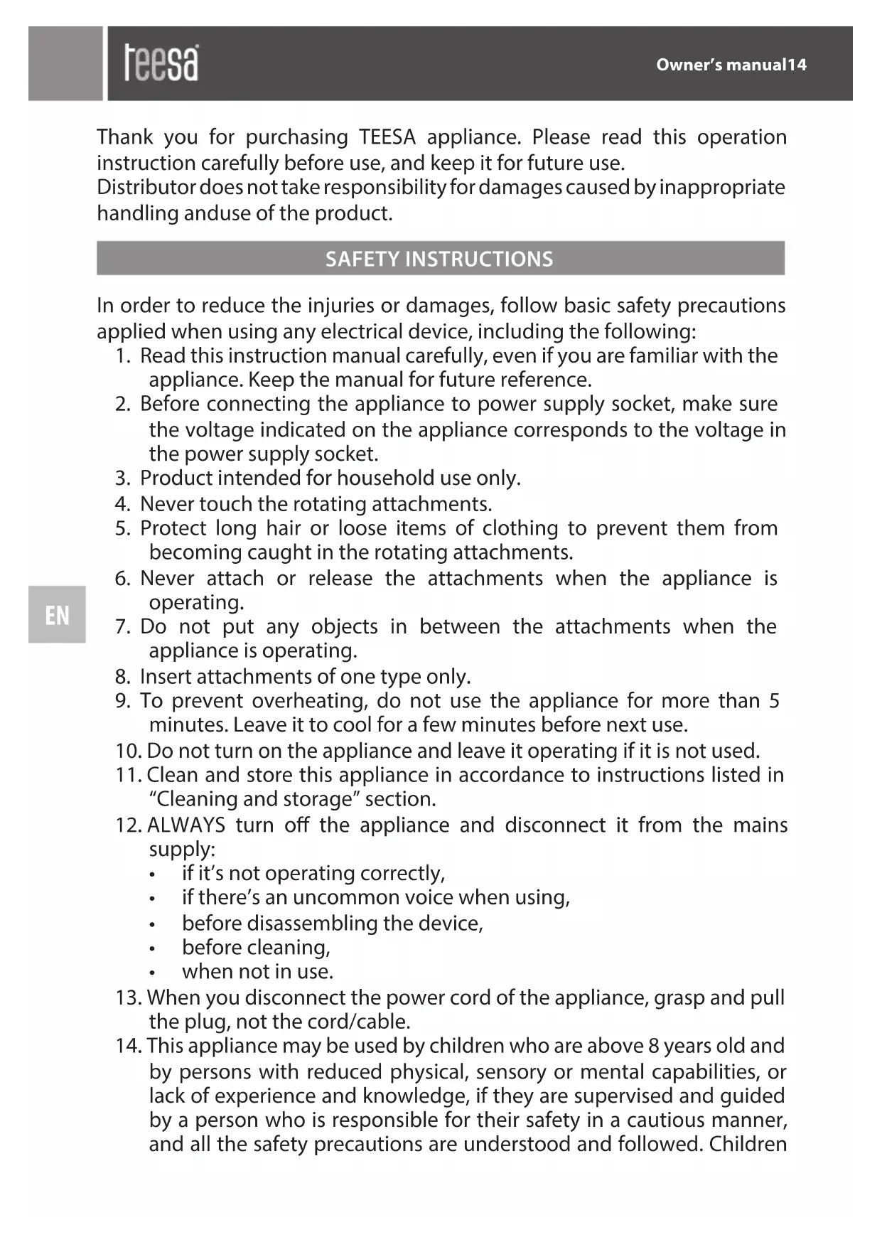 14. This appliance may be used by children who are above 8 years old and